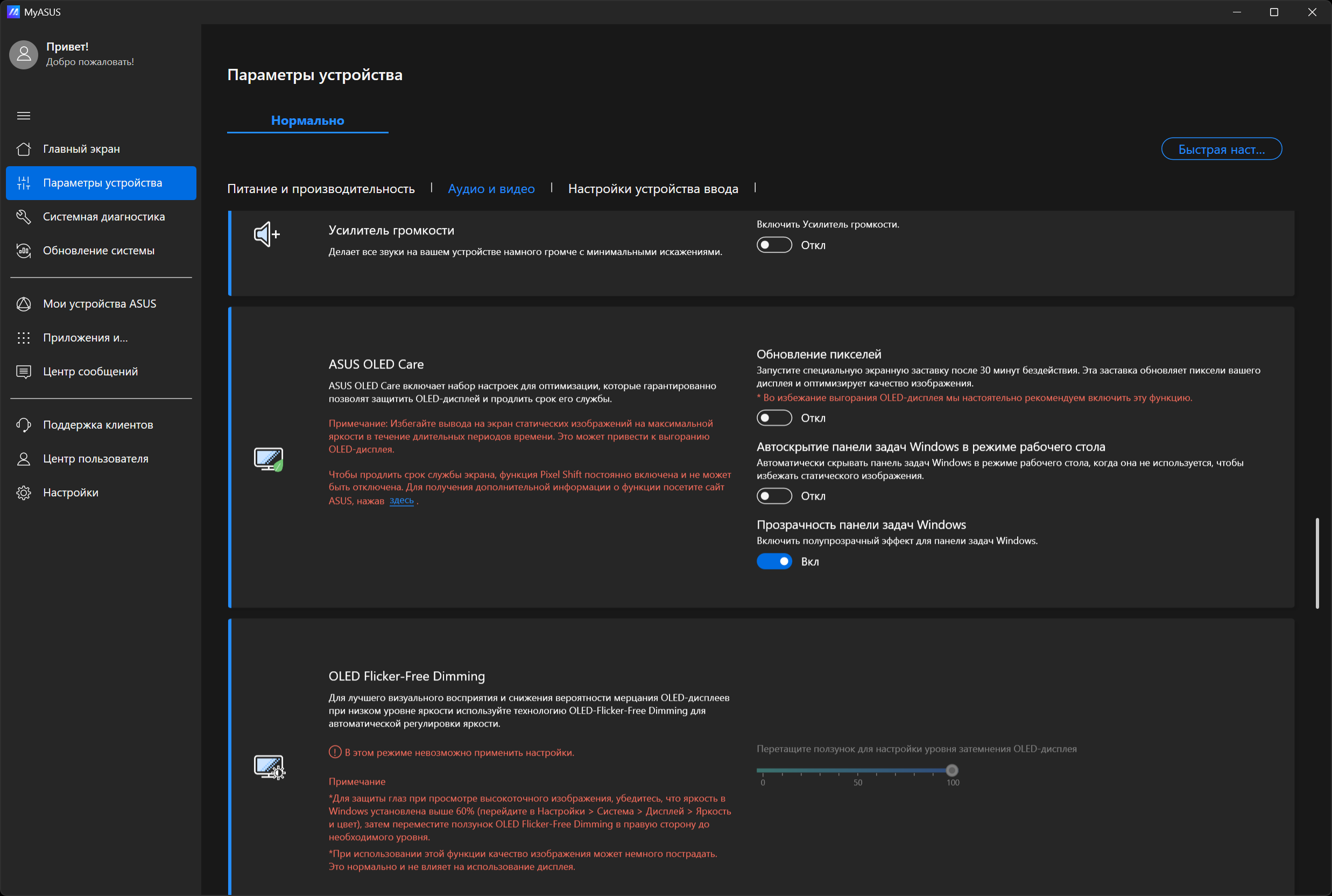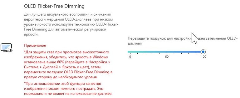 Тем не менее для снижения мерцания производитель предлагает воспользоваться функцией OLED Flicker-Free Dimming (доступна на закладке утилиты MyAsus):