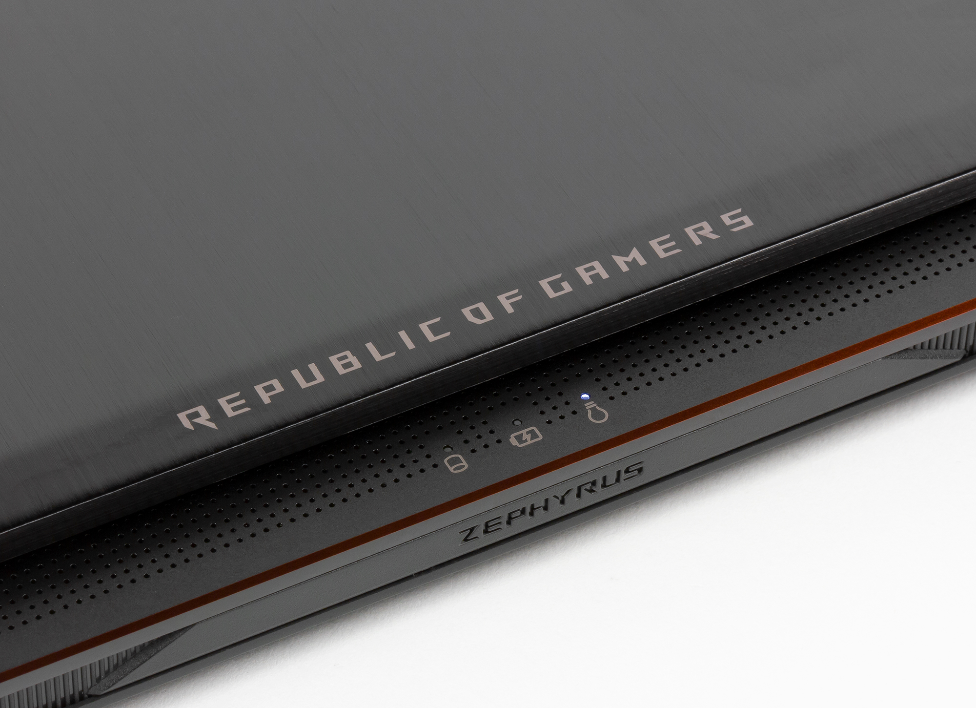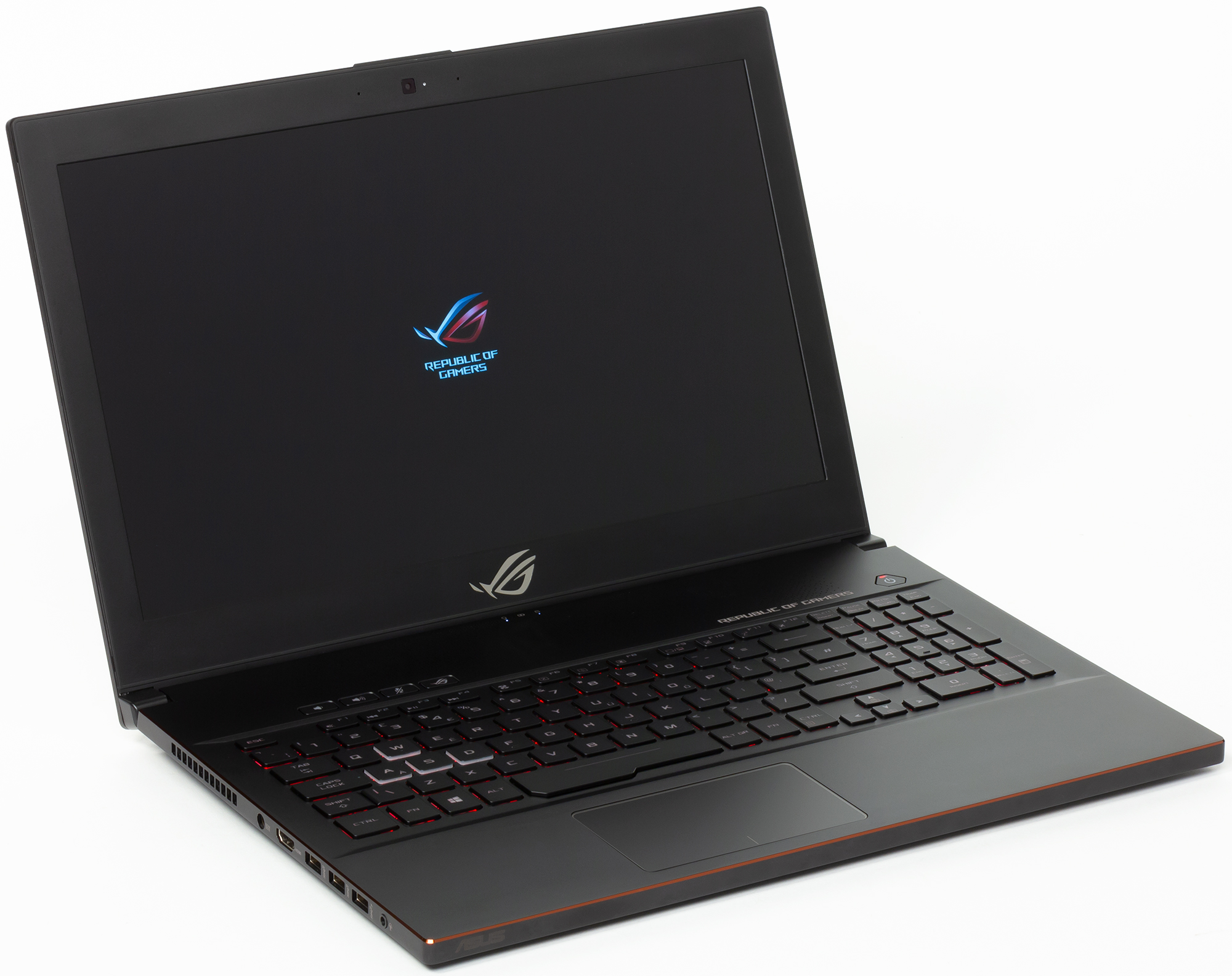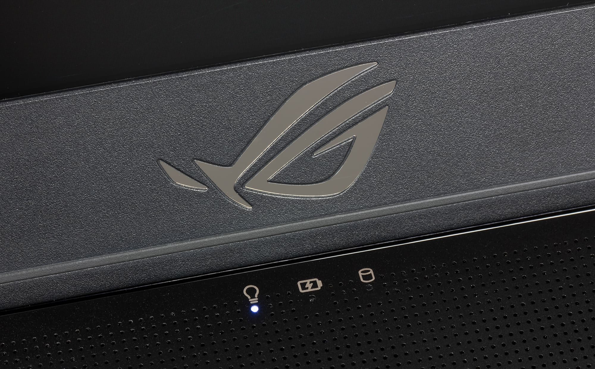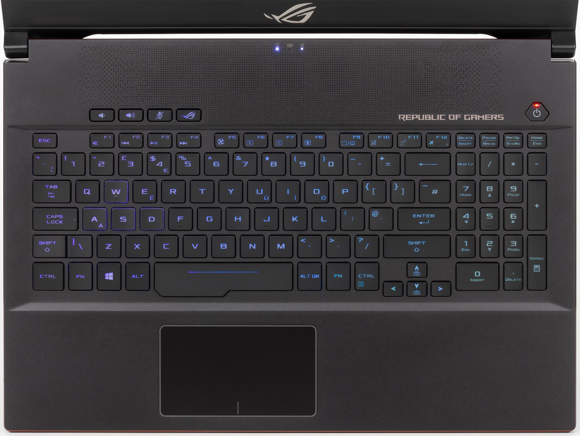 На верхней части рамки расположены веб-камера и отверстия двух микрофонов, а снизу — зеркальная надпись Republic Of Gamers.