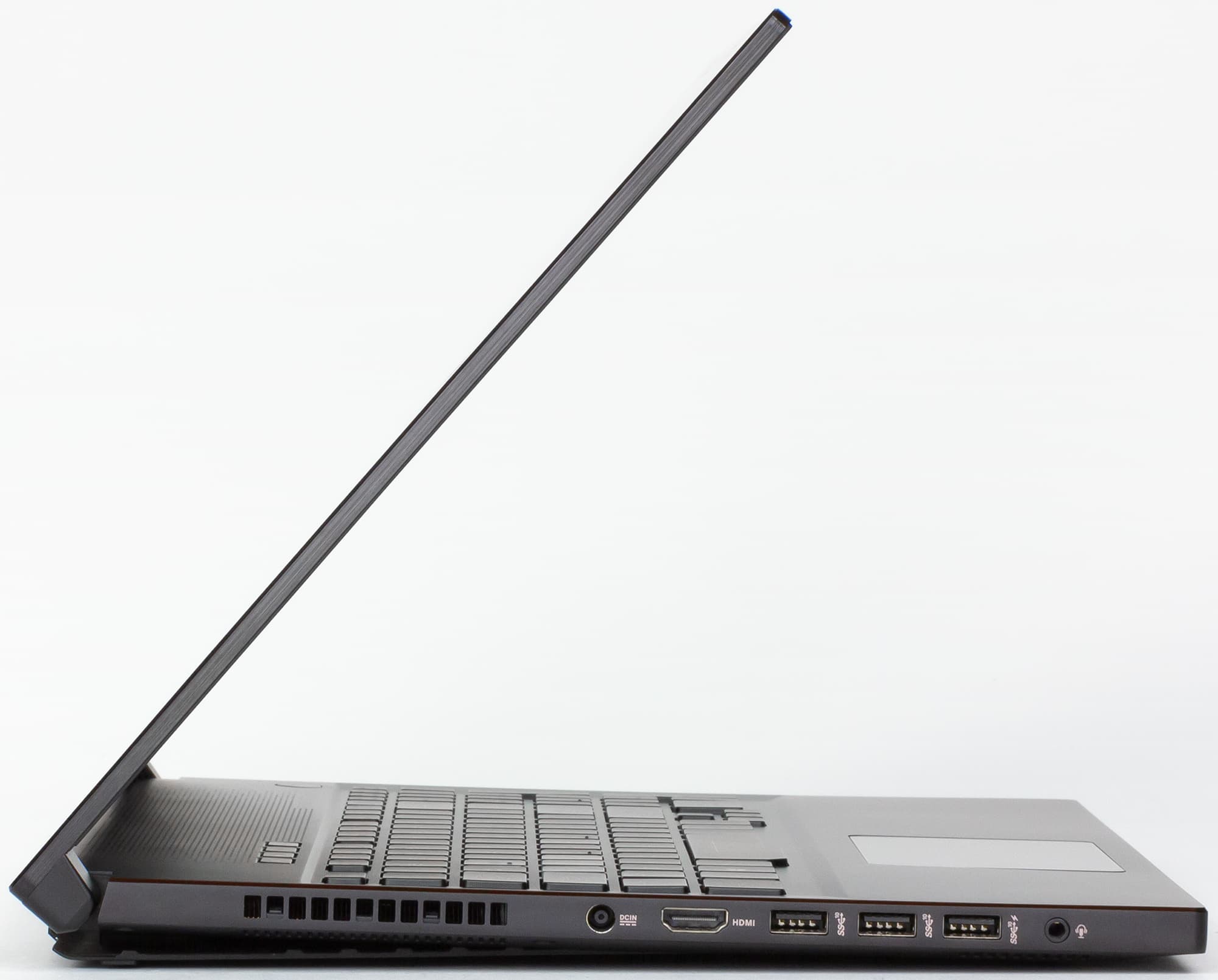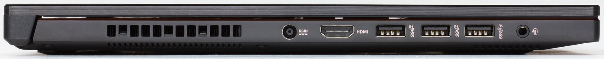 На левом торце корпуса ноутбука расположены три порта USB 3.1 (Type-A), разъем HDMI, комбинированный аудиоразъем типа миниджек и разъем питания.
