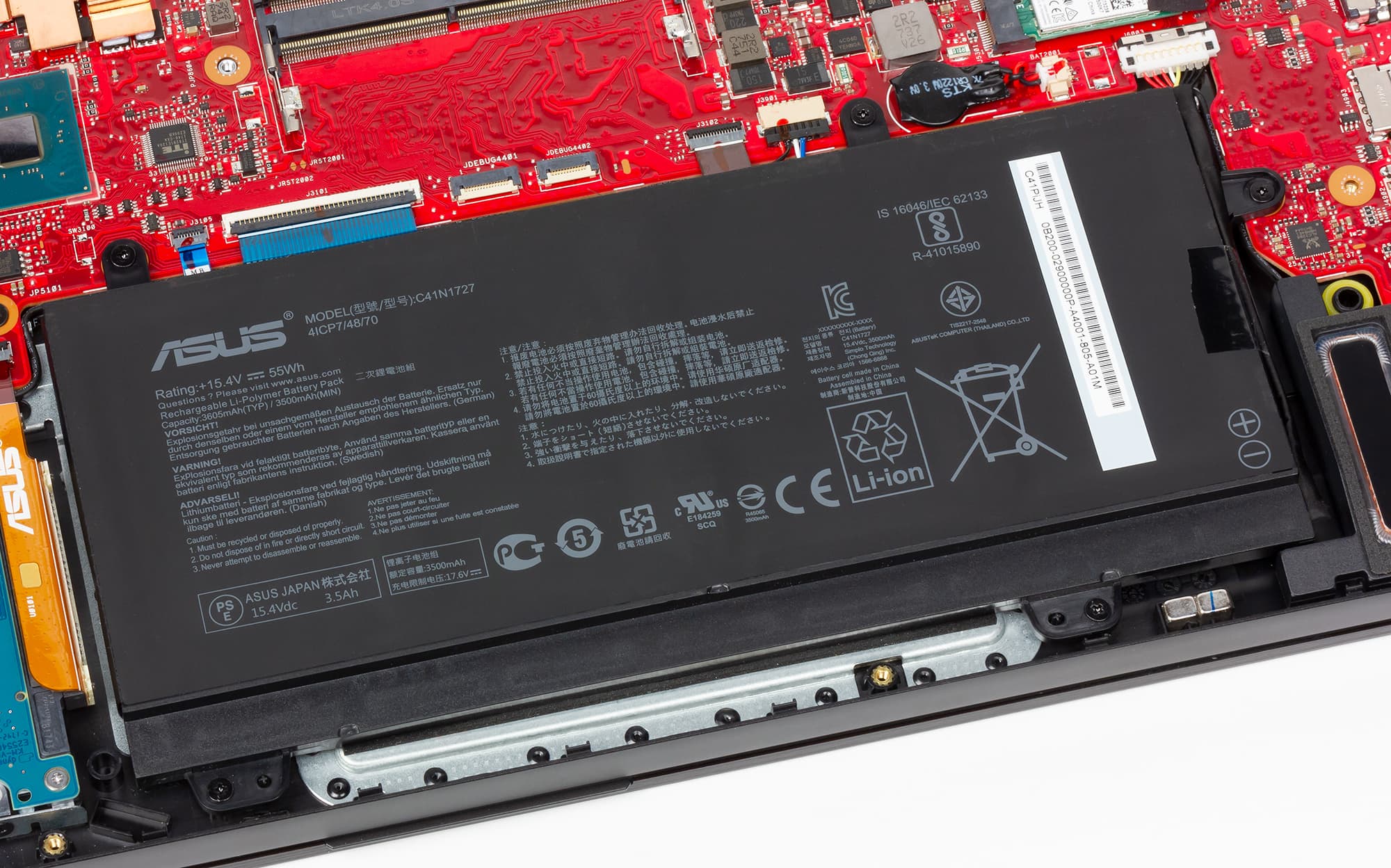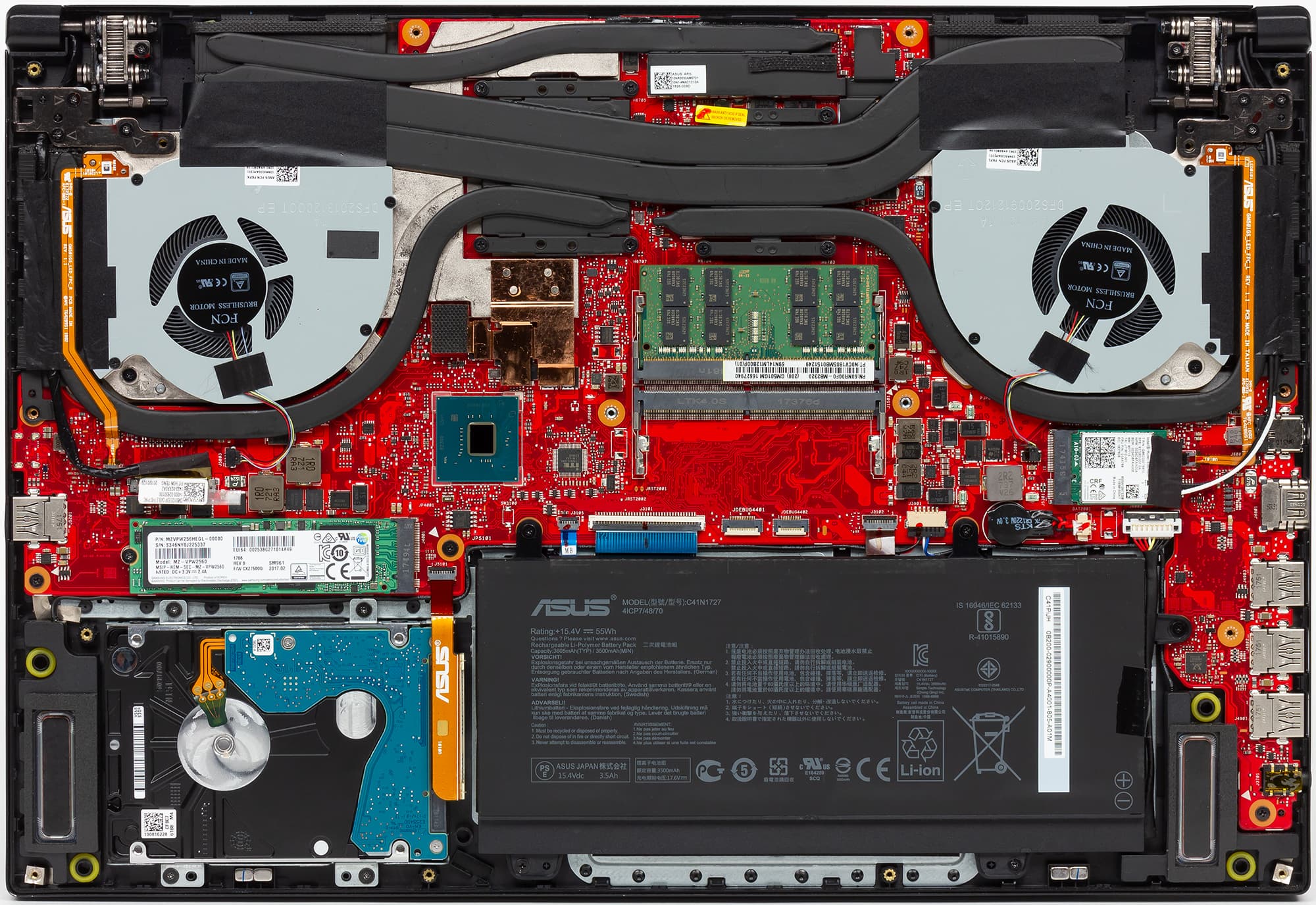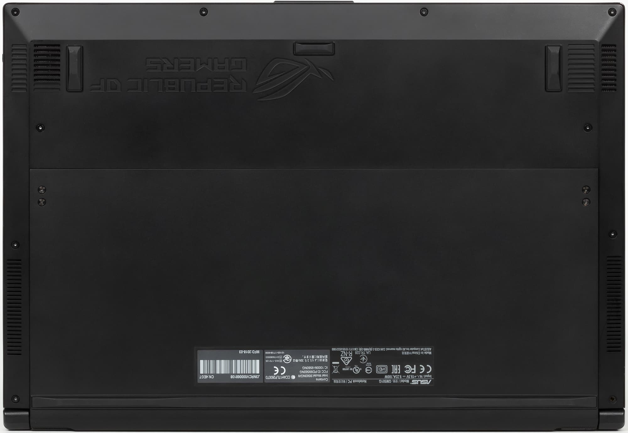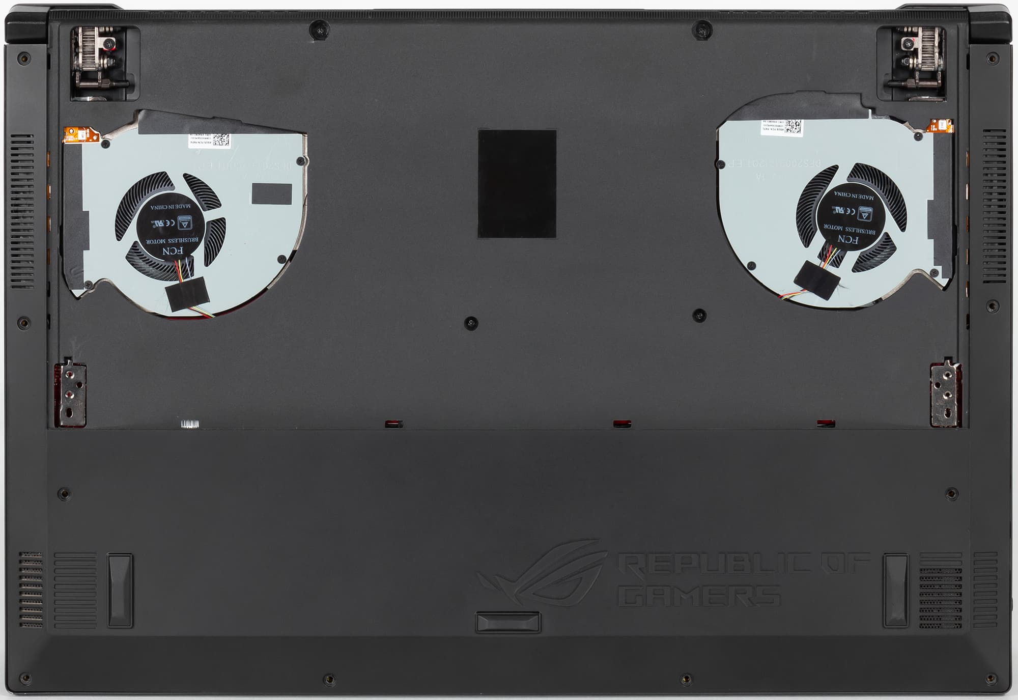 Ноутбук Asus ROG Zephyrus M GM501GM несложно разобрать. Нижняя панель в данном случае составная. Сняв одну часть панели, пользователь получит доступ только к вентиляторам системы охлаждения, чтобы продуть их пылесосом.