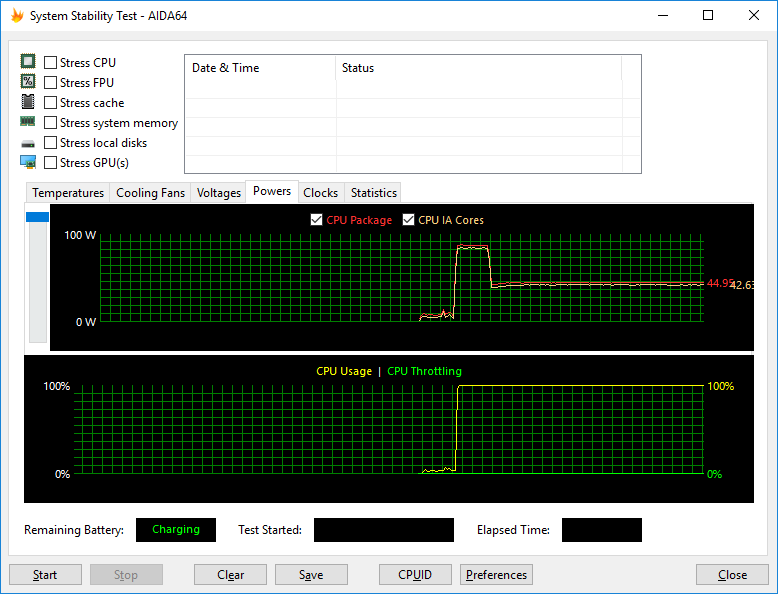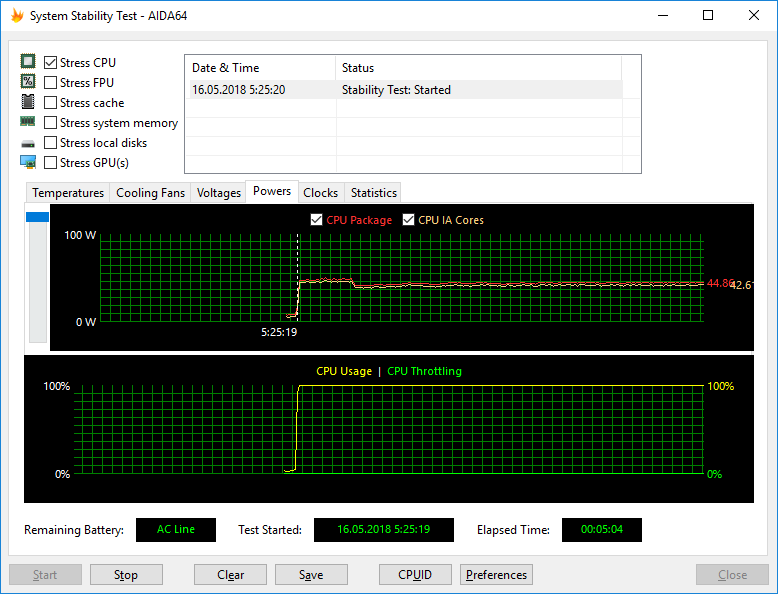 Температура ядер процессора в таком режиме опять-таки составляет 75 °C, а мощность энергопотребления составляет 45 Вт. Таким образом, в ноутбуке успешно работает адаптация параметров работы процессора под тепловой пакет.
