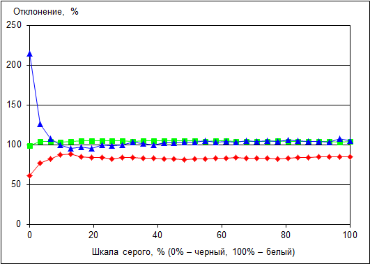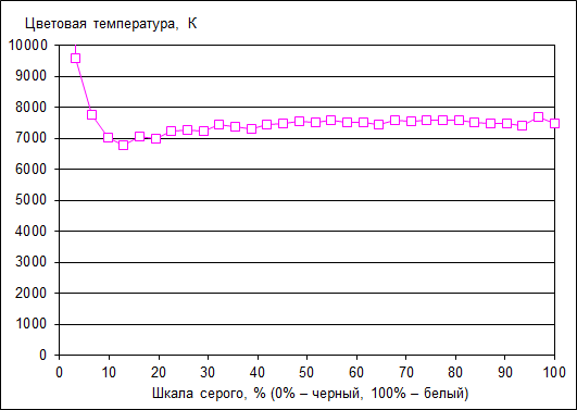 Цветовая температура ЖК-экрана стабильна по всей шкале серого и составляет примерно 7500 K.