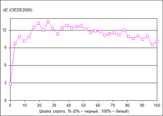 Что касается точности цветопередачи (дельта Е), то ее значение не превосходит 13 по всей шкале серого, что допустимо для данного класса экранов.