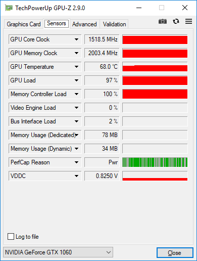 Как выяснилось в ходе тестирования, в режиме стрессовой загрузки (FurMark) частота GPU видеокарты Nvidia GeForce GTX 1060 составляет 1518 МГц, а частота памяти — 2003 МГц.