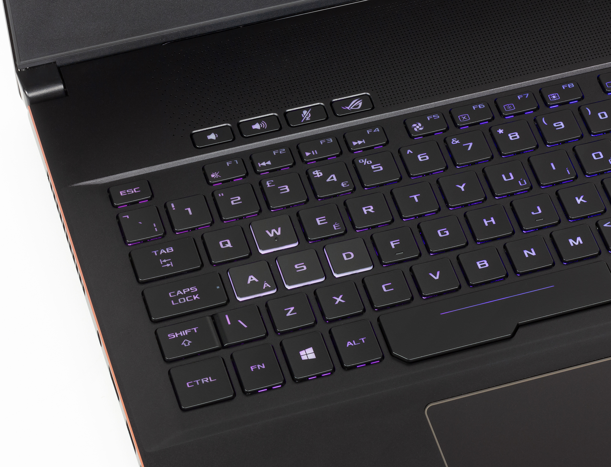 Сами клавиши черного цвета, а символы на них — белого. Клавиатура имеет трехуровневую RGB-подсветку, которую можно настраивать с использованием приложения ROG Gaming Center. В том числе, можно задавать цвет подсветки, выделять цветом до 4 зон и использовать различные цветовые эффекты. Кроме того, выделена зона игровых клавиш WASD: боковые торцы этих клавиш — полупрозрачного белого цвета и подсвечиваются.
