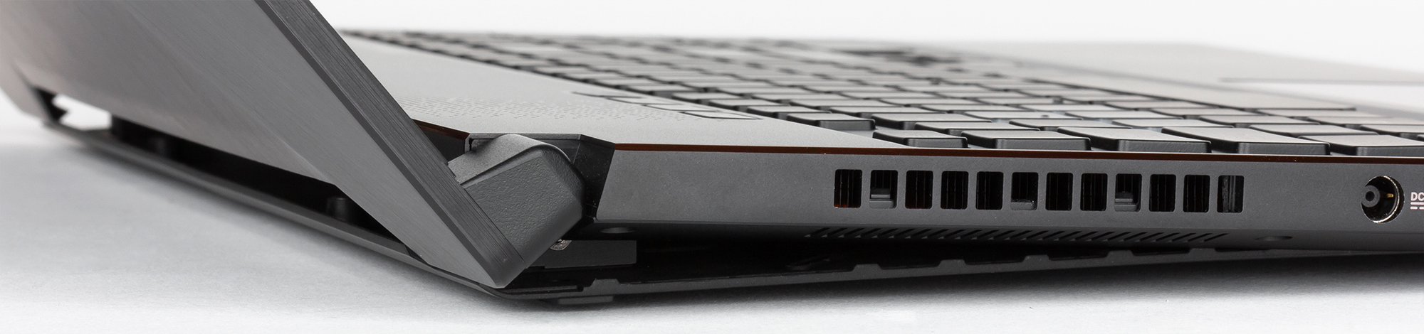 Для улучшения эффективности охлаждения в данном случае используется точно такой же прием, как в ноутбуке Asus ROG Zephyrus: при открытии крышки ноутбука специальный механизм немного смещает нижнюю панель корпуса, в результате чего между нижней панелью и корпусом образуется вентиляционный зазор. При закрытии крышки зазор исчезает. Во время работы этот вентиляционный зазор подсвечивается красным цветом слева и справа.