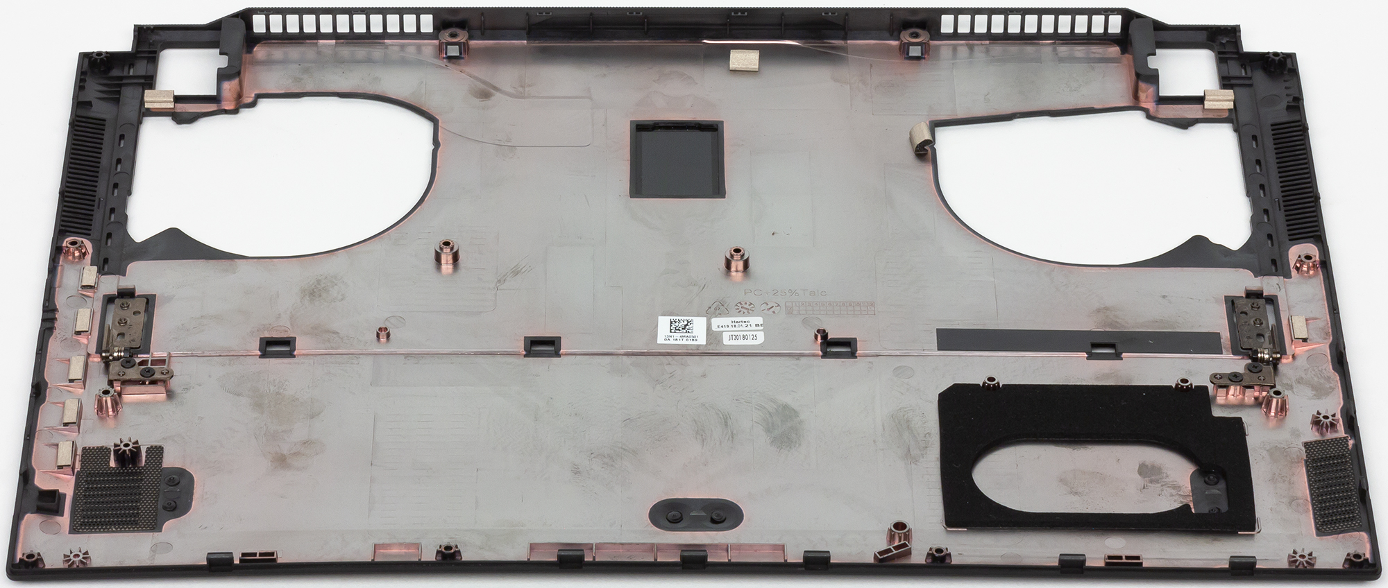 Нижняя панель корпуса выполнена из обычного черного матового пластика. На нижней панели нет никаких вентиляционных отверстий, но есть прорезиненная полоска, которая обеспечивает устойчивое положение ноутбука на горизонтальной поверхности.