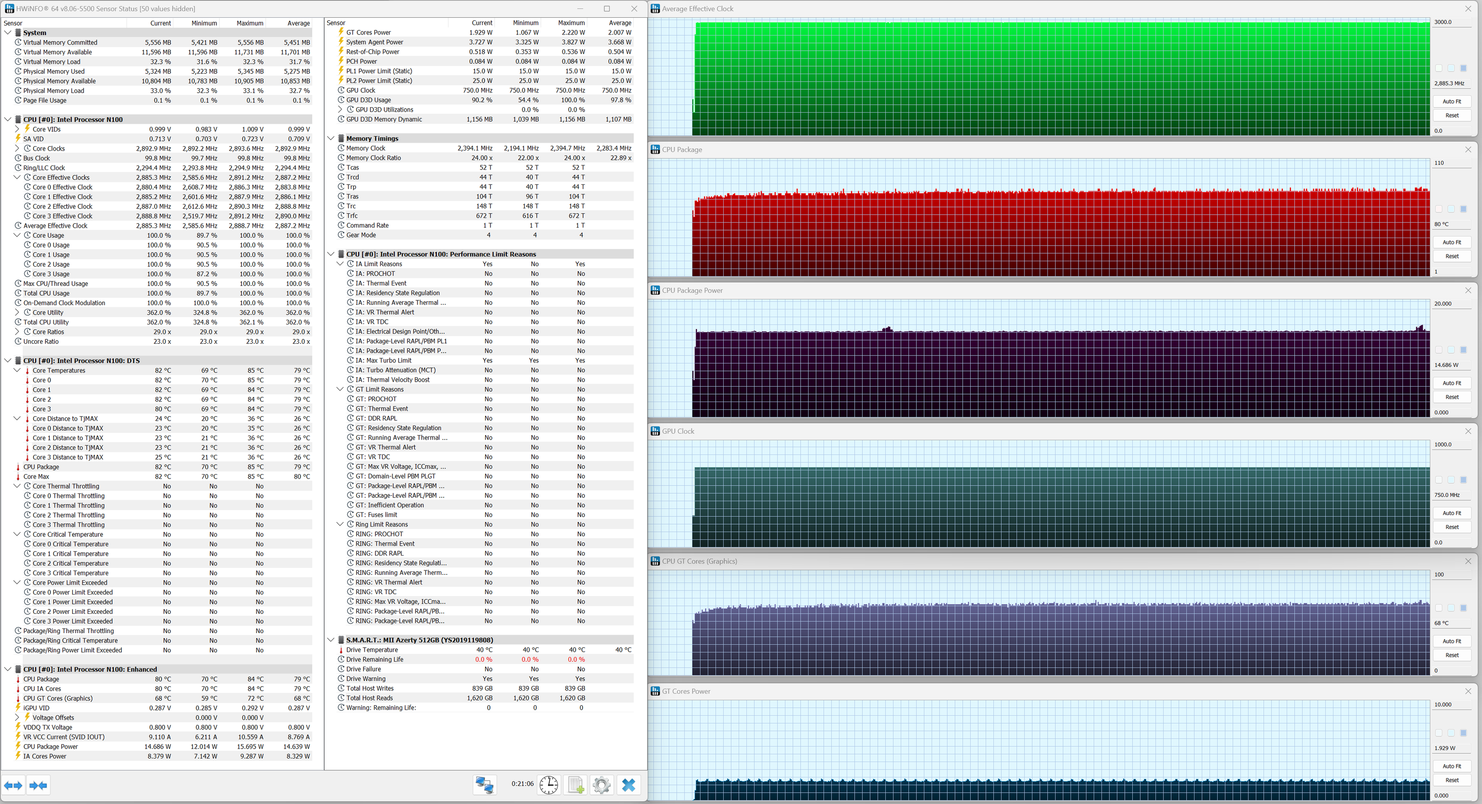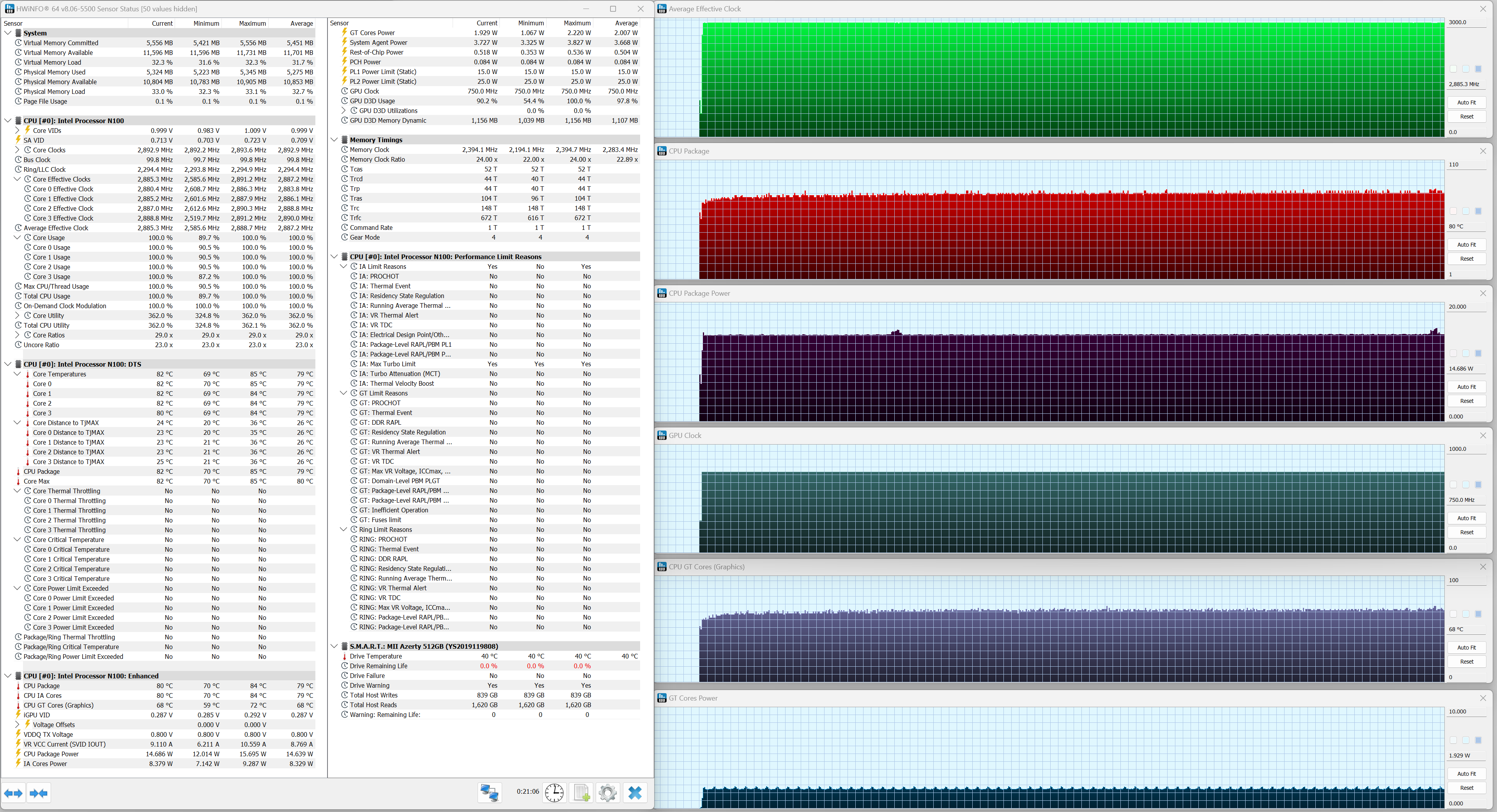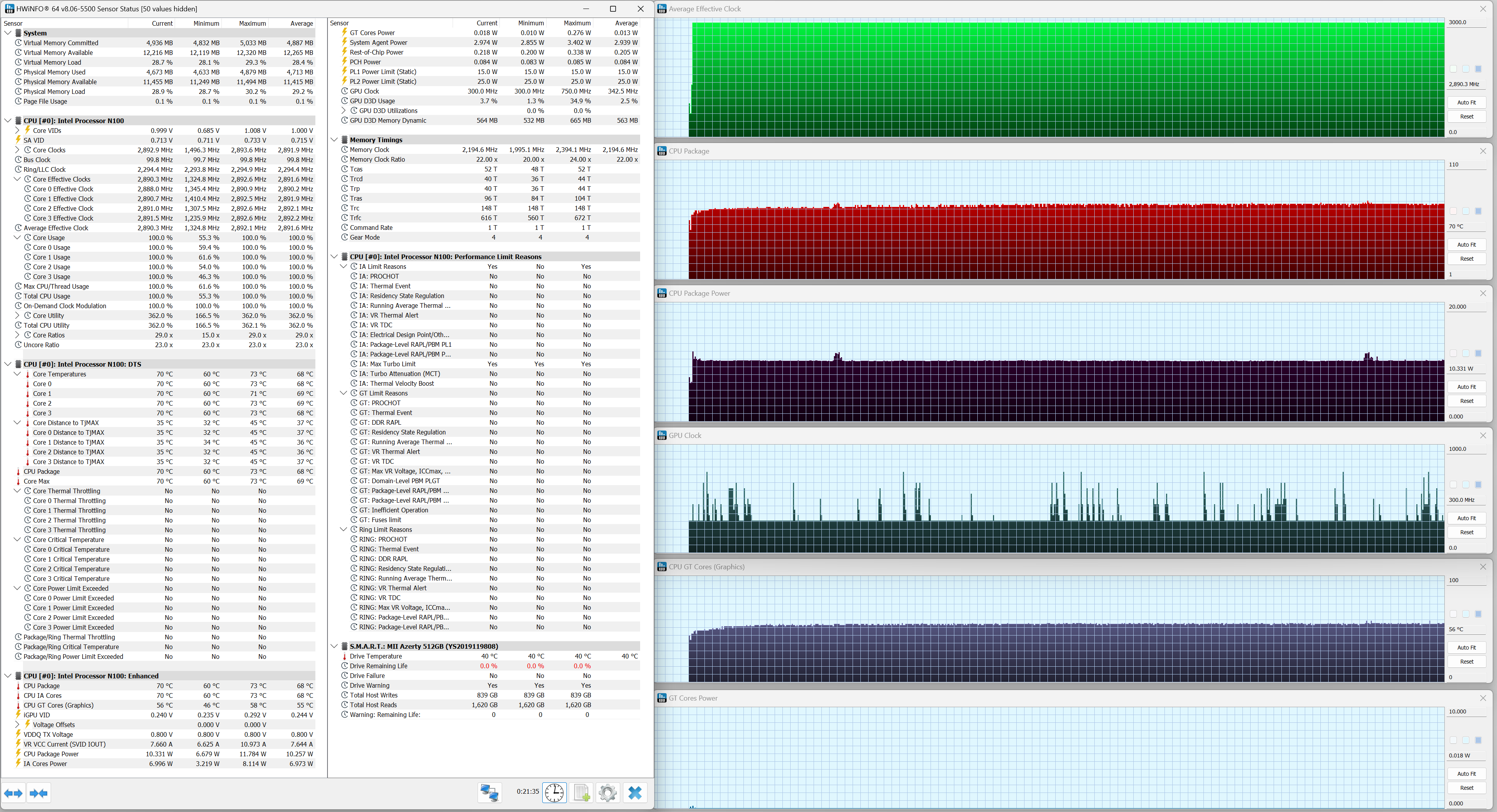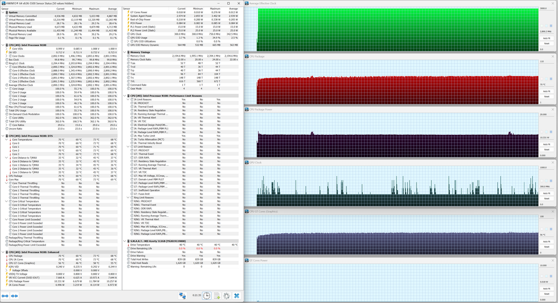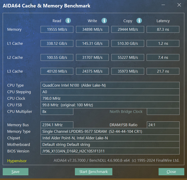 Azerty RD-1650 обладает четырехъядерным процессором Intel N100 (Alder Lake-N, архитектура Gracemont, техпроцесс 10 нм), выпущенным в январе 2023 г. Hyper Threading не реализован (ядра функционируют в однопотоковом режиме). Поддерживается работа с ОЗУ DDR4/DDR5 (до 4800 МГц) в одноканальном режиме. TDP 6 Вт, максимальная температура 105 °C. Мы будем сравнивать быстродействие Azerty RB-1650 с двумя другими ноутбуками: