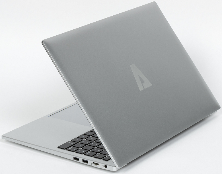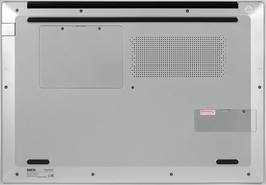 Ноутбук обладает 16-дюймовым экраном — чуть более крупным, чем широко распространенные 15,6-дюймовые. К тому же соотношение сторон дисплея составляет 16:10, это удобнее в работе, но экран крупнее и по высоте, так что внешне машина отнюдь не выглядит малюткой. На лицевую сторону крышки в центре нанесен логотип Azerty. При работе он не подсвечивается.