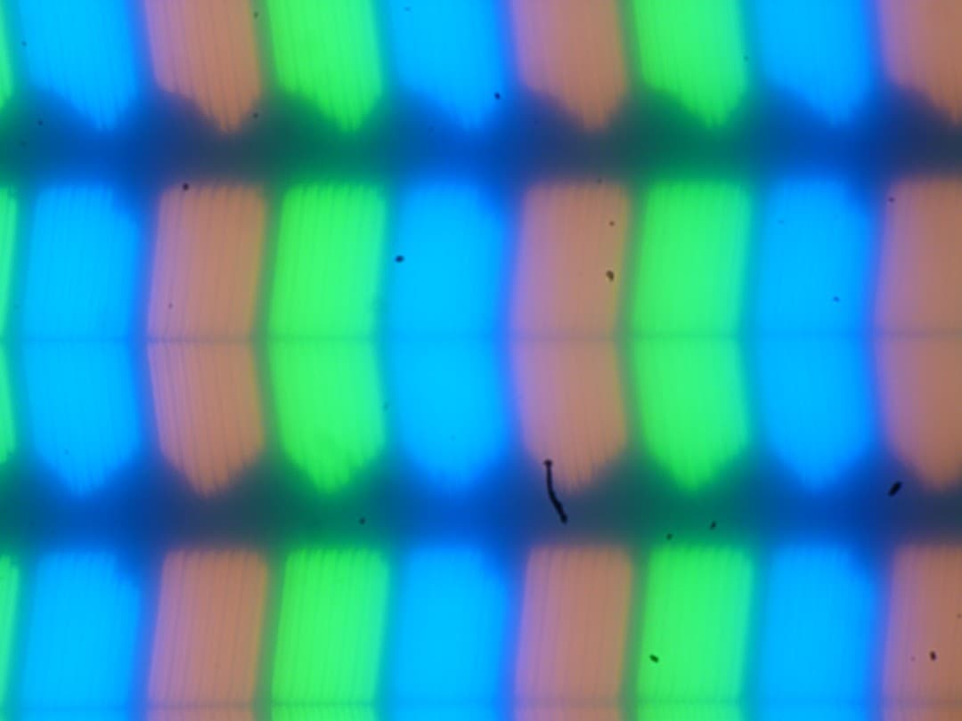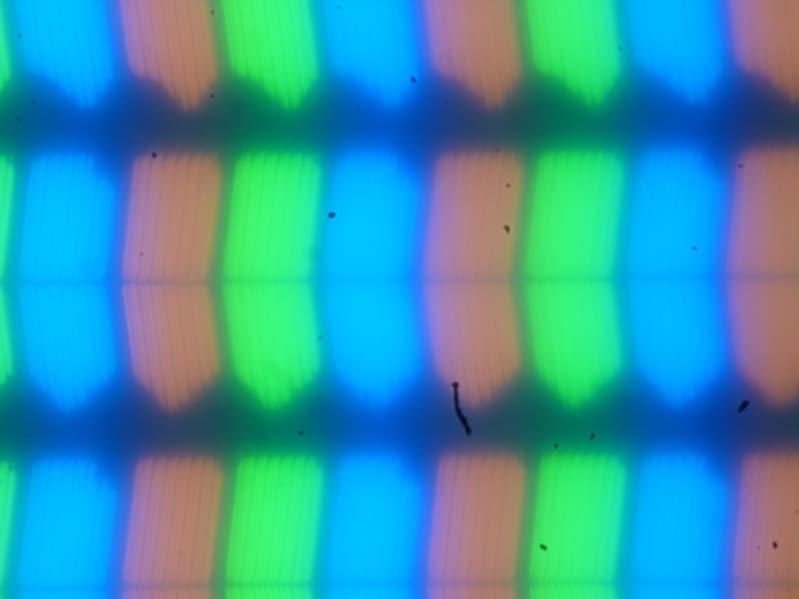 В этом ноутбуке используется матрица типа IPS. Микрофотографии демонстрируют типичную для IPS структуру субпикселей (черные точки — это пыль на матрице фотоаппарата):
