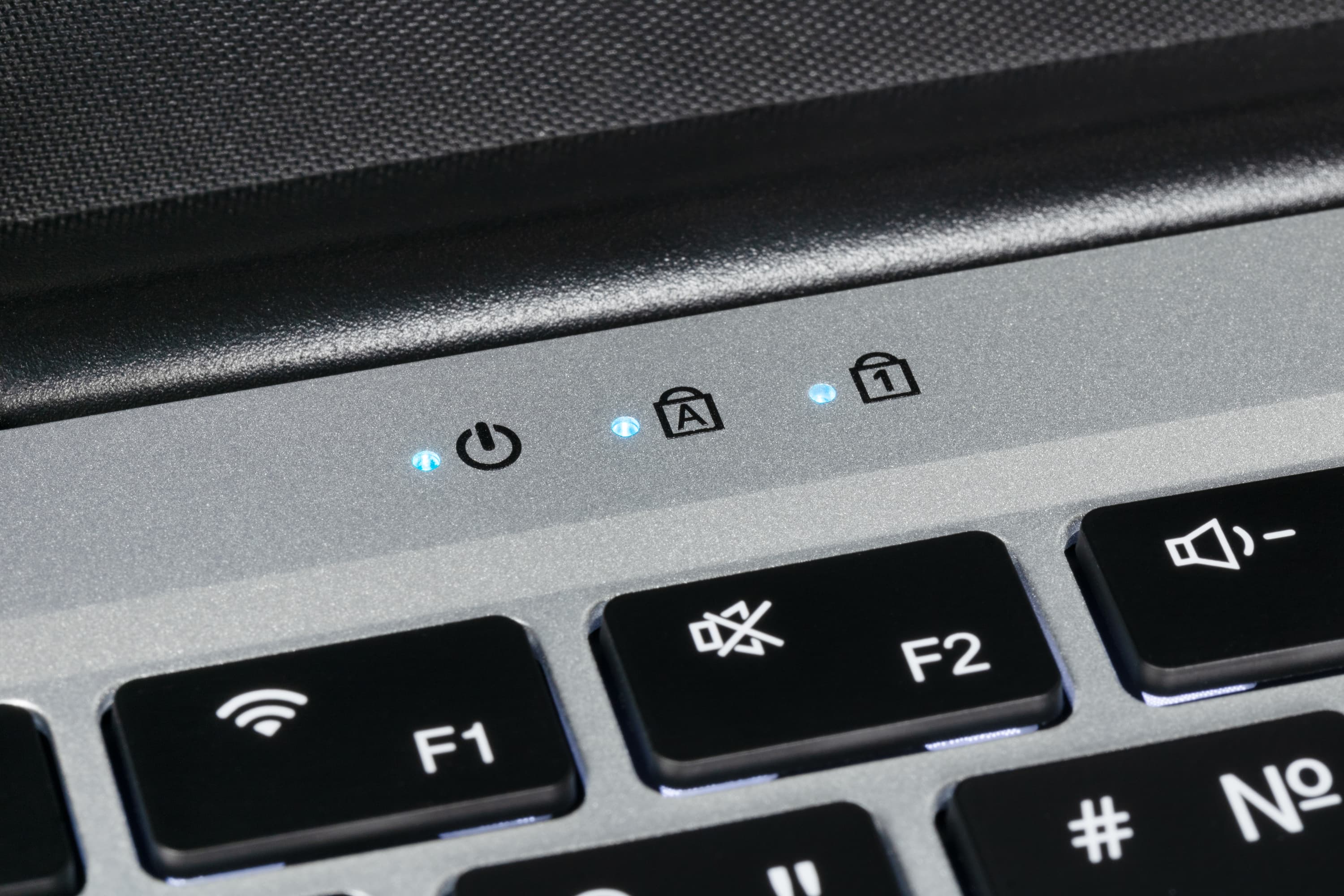 Слева над верхним рядом клавиатуры размещены светодиодные индикаторы, сигнализирующие о включенном питании ноутбука и состоянии регистров Caps Lock и Num Lock.