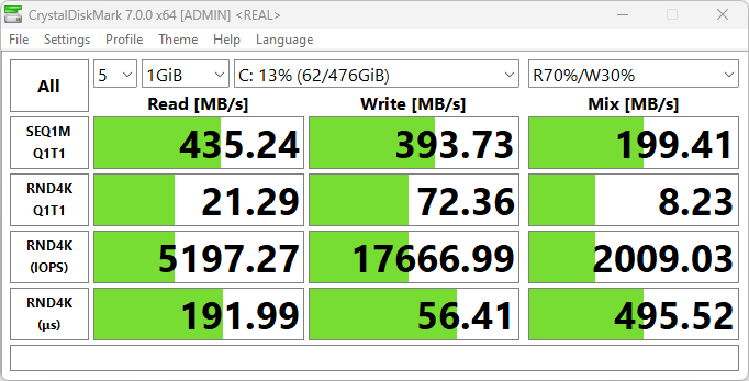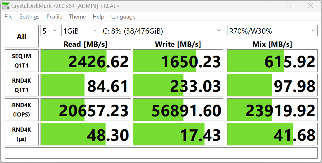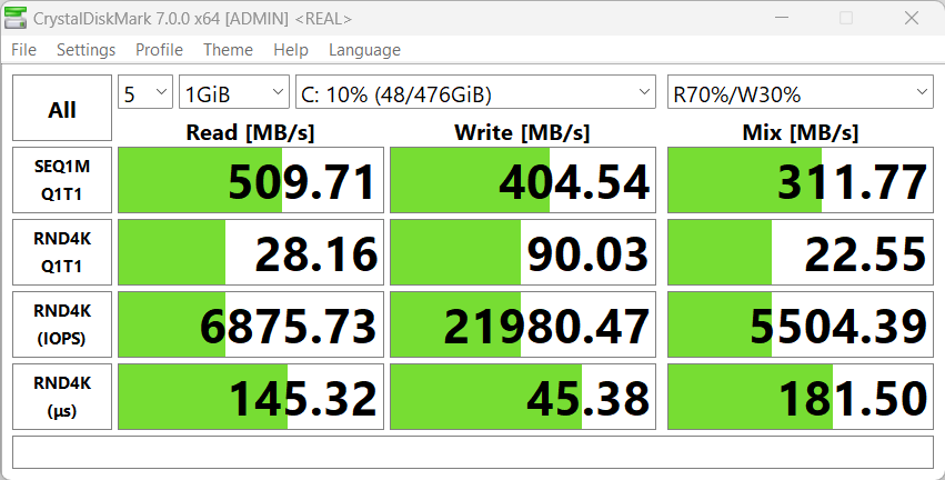 В роли хранилища установленных программ и пользовательских данных выступает 512-гигабайтный накопитель с интерфейсом SATA. В процессе тестирования с помощью популярного бенчмарка CrystalDiskMark определим его возможности.