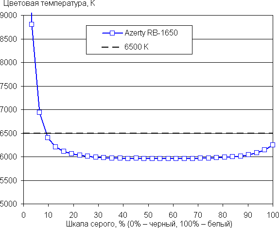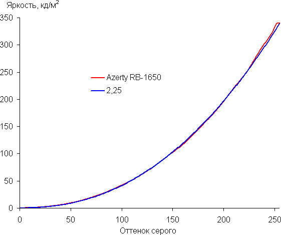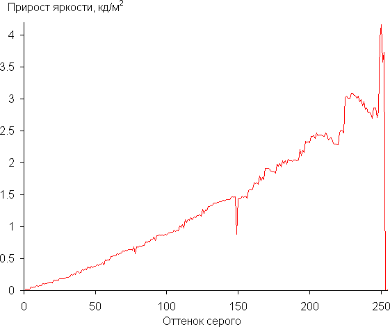 Рост прироста яркости на большей части шкалы серого более-менее равномерный, и каждый следующий оттенок ярче предыдущего, за исключением трех самых светлых оттенков, которые по яркости от белого не отличаются. В самой темной области аппаратно и визуально хорошо различаются все оттенки:
