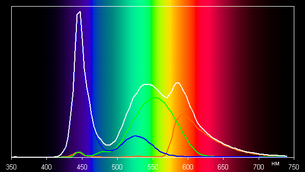 Такой спектр с относительно узким пиком синего и с широкими горбами зеленого и красного цветов характерен для экранов, в которых используется белая светодиодная подсветка с синим излучателем и желтым люминофором. Спектры показывают, что светофильтры матрицы значительно подмешивают компоненты друг к другу, что и сужает цветовой охват.