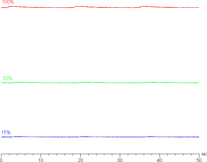 На любом уровне яркости значимая модуляция подсветки отсутствует, поэтому нет и никакого мерцания экрана (нет ШИМ). В доказательство приведем графики зависимости яркости (вертикальная ось) от времени (горизонтальная ось) при различных значениях настройки яркости: