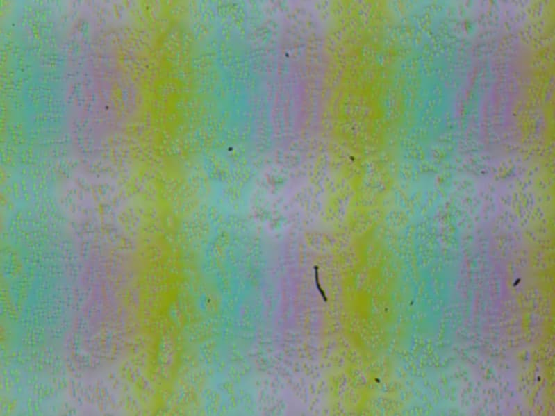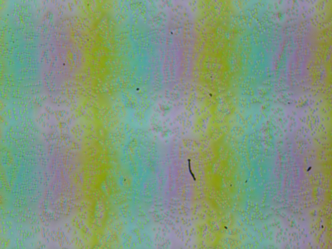 Зерно этих дефектов в несколько раз меньше размеров субпикселей (масштаб этих двух фотографий примерно одинаковый), поэтому фокусировка на микродефектах и «перескок» фокуса по субпикселям при изменении угла зрения выражены слабо, из-за этого нет и «кристаллического» эффекта.