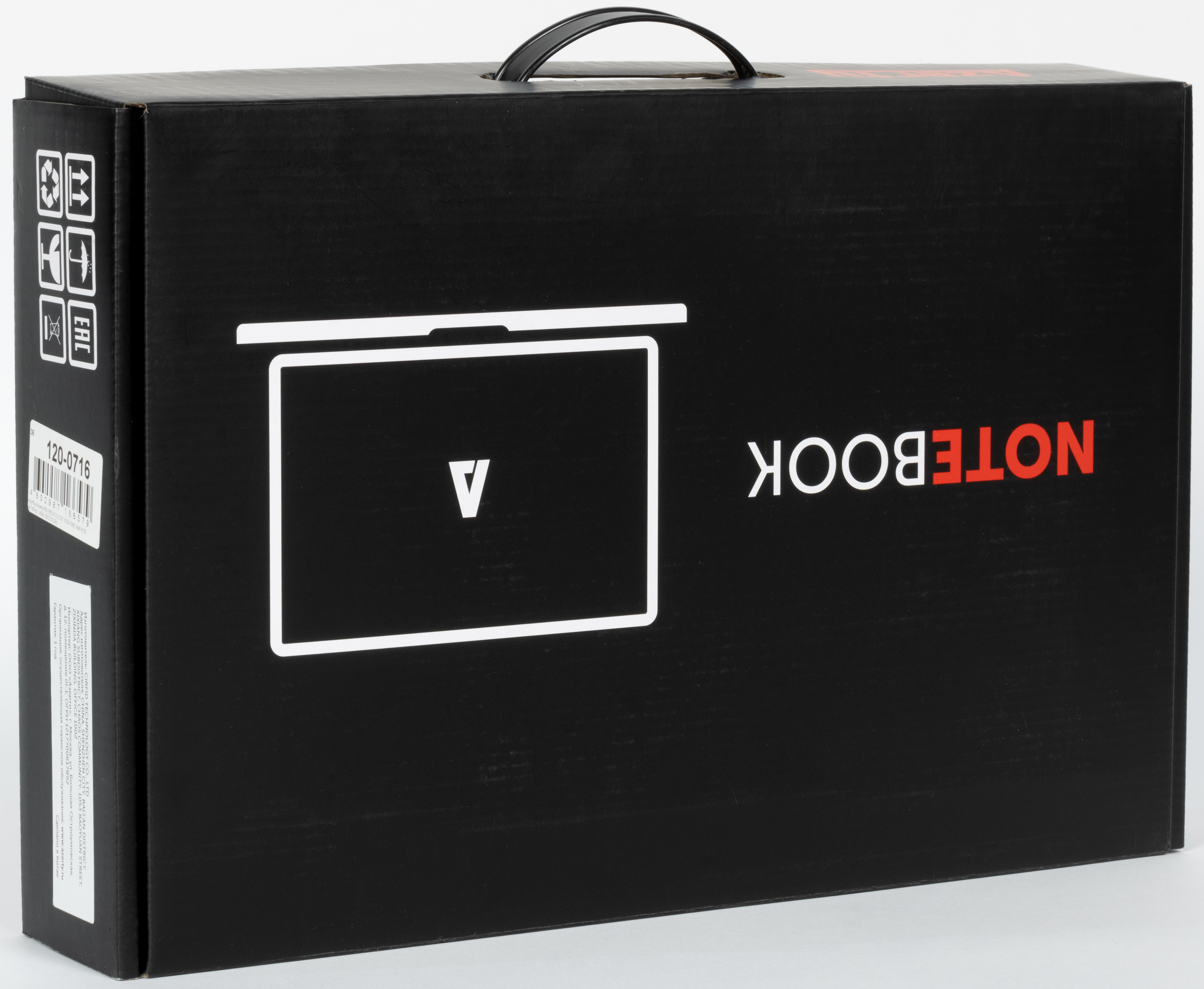 Коробка сделана неплохо. Для удобства переноски она снабжена пластмассовой ручкой-вставкой, но при удержании за эту самую ручку надпись «Notebook A» оказывается перевернутой с ног на голову. Видимо планировалось, что на крышку будут смотреть с того места, где она открывается.