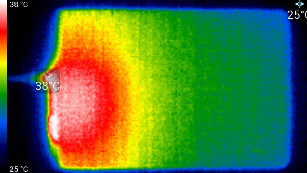 Нагрев локализован в правой части аппарата (при ладшафтной ориентации разъемом вправо), что, видимо, соответствует расположению микросхемы SoC и цепям зарядки (во время теста планшет был подключен к зарядке). По данным теплокамеры, максимальный нагрев составил 38 градусов (при температуре окружающего воздуха в 24 градуса), это не очень много.