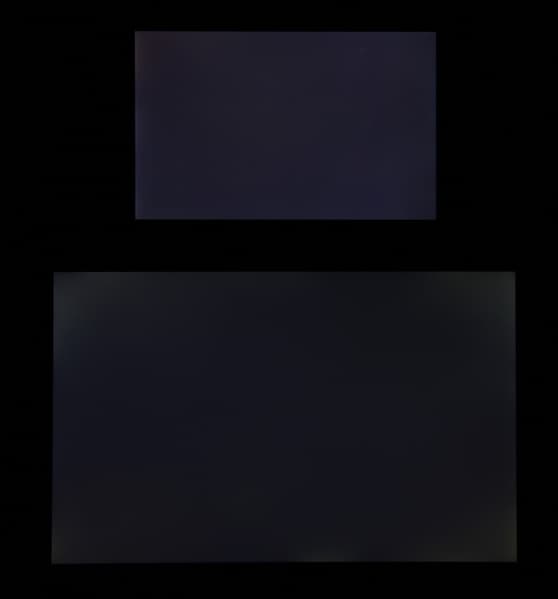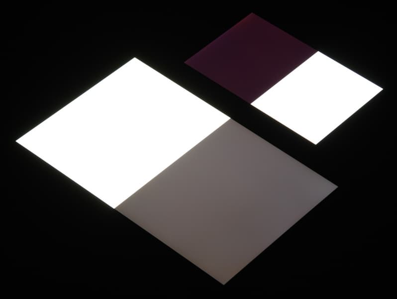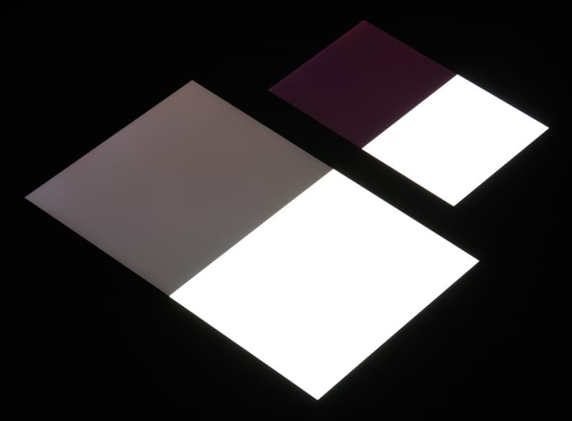 Черное поле при отклонении по диагонали сильно высветляется и приобретает легкий красноватый оттенок. Фотографии ниже это демонстрируют (яркость белых участков в перпендикулярном плоскости экранов направлении одинаковая!):