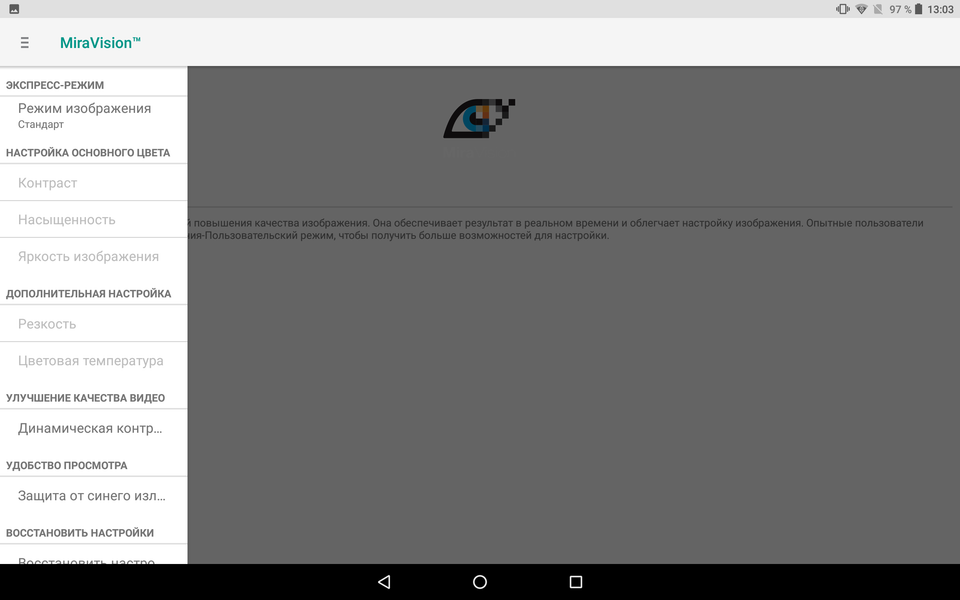 В этом устройстве есть достаточно продвинутая система из профилей и настроек, предоставляющая возможность скорректировать цветовой баланс и пр. Называется она MiraVision.