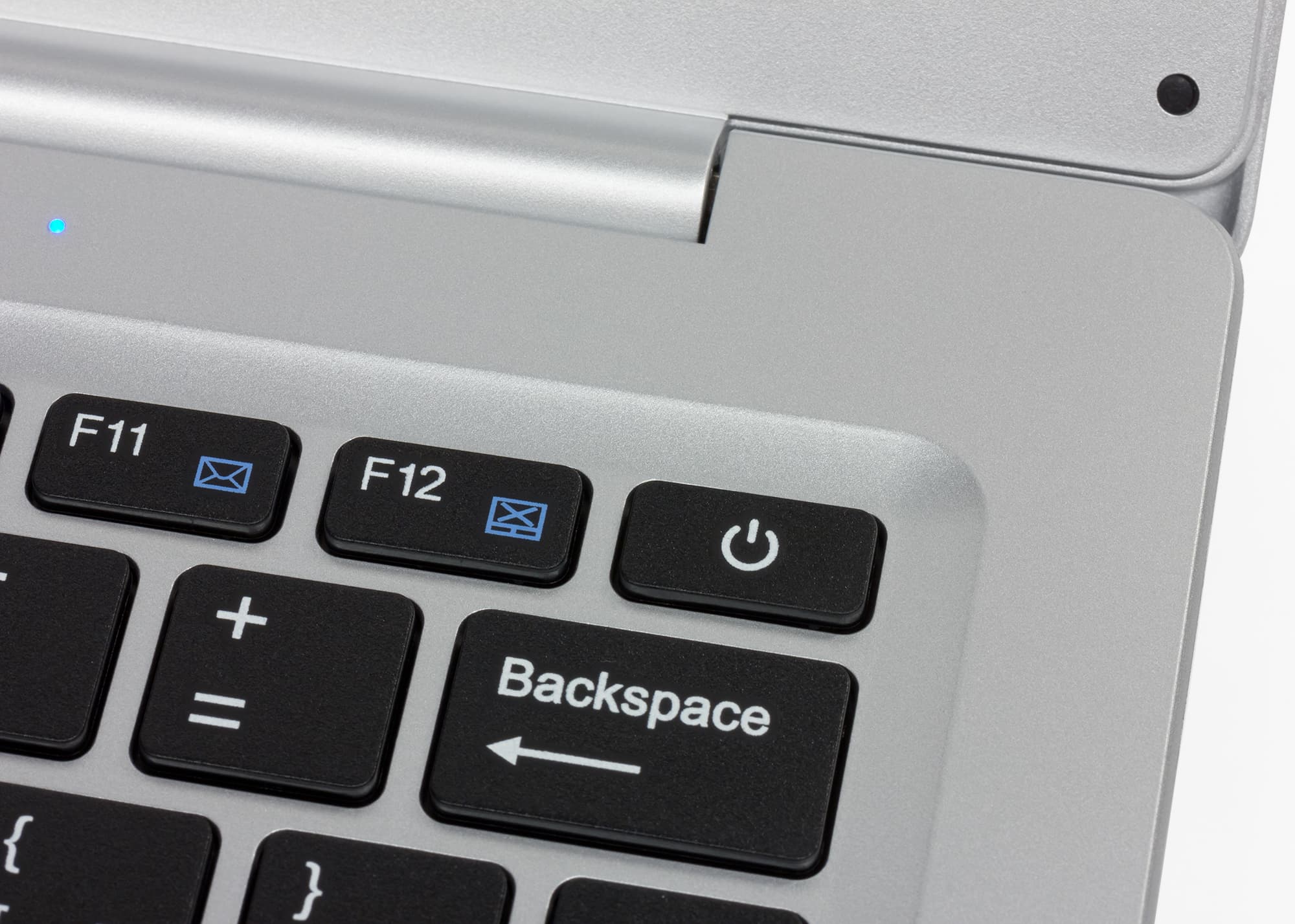 Кнопка включения ноутбука расположена в правом верхнем углу клавиатуры.