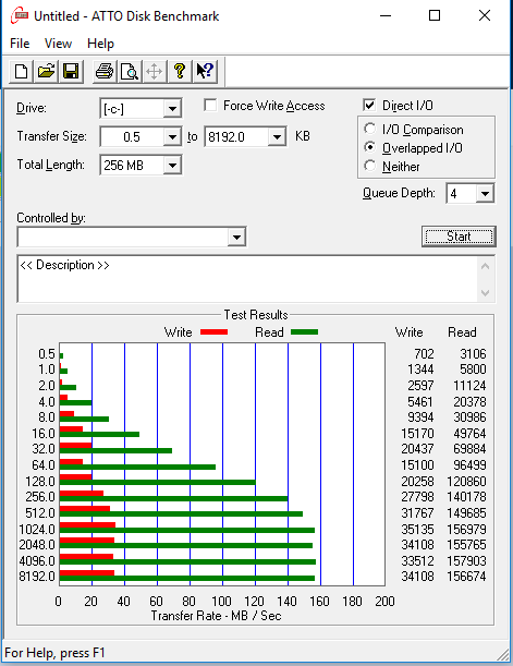 Утилита ATTO Disk Benchmark определяет максимальную скорость последовательного чтения этого накопителя на уровне 155 МБ/с, а скорость последовательной записи — на уровне 30 МБ/с.