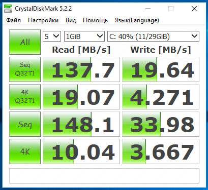 Как уже отмечалось, подсистема хранения данных ноутбука представляет собой eMMC-накопитель Toshiba 032G96 емкостью всего 32 ГБ. Конечно, ожидать от такого накопителя высокой производительности не приходится.