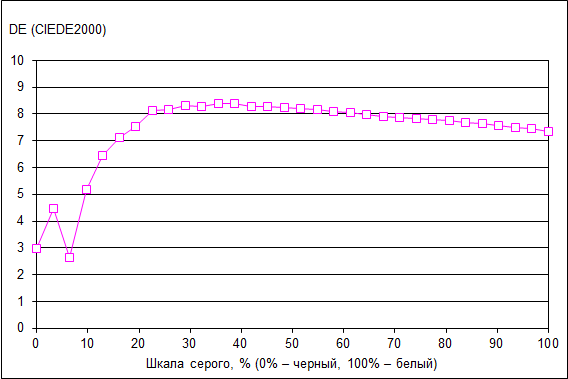 Что касается точности цветопередачи (дельта Е), то ее значение не превосходит 9, что является допустимым результатом для данного класса экранов.