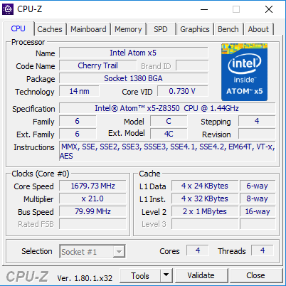 Итак, основой ноутбука Digma Eve 300 (ES3004EW) является процессор (SoC) Intel Atom X5 Z8350 (кодовое наименование Cherry Trail). Процессор четырехъядерный, его базовая тактовая частота составляет 1,44 ГГц, а в режиме Turbo Boost она может повышаться до 1,92 ГГц. Расчетная мощность (SDP) Atom X5 Z8350 составляет всего 2 Вт. В этот процессор интегрировано графическое ядро Intel HD Graphics 400. Контроллер памяти в процессоре одноканальный, максимальный объем поддерживаемой памяти составляет 2 ГБ, поддерживается только память DDR3-1600.