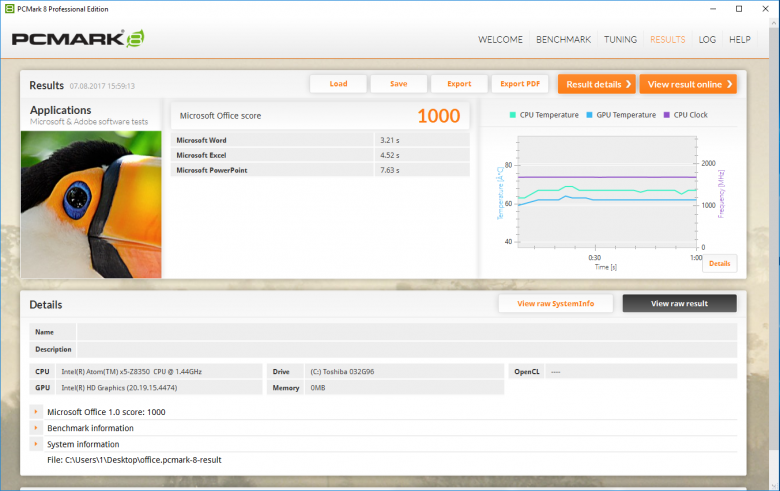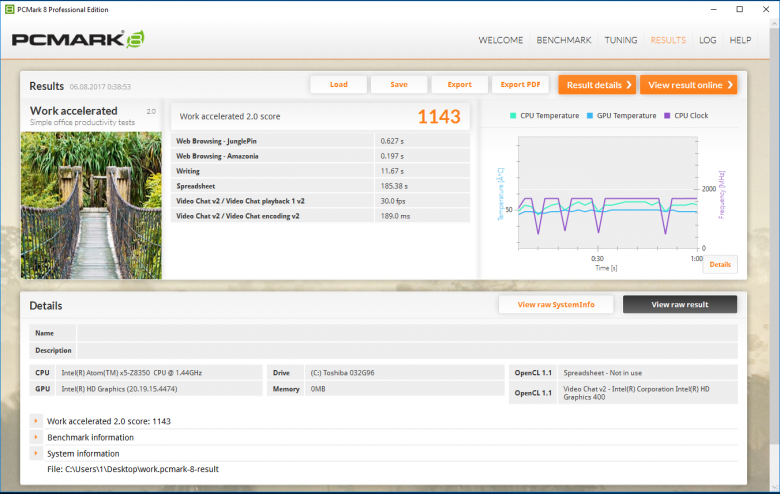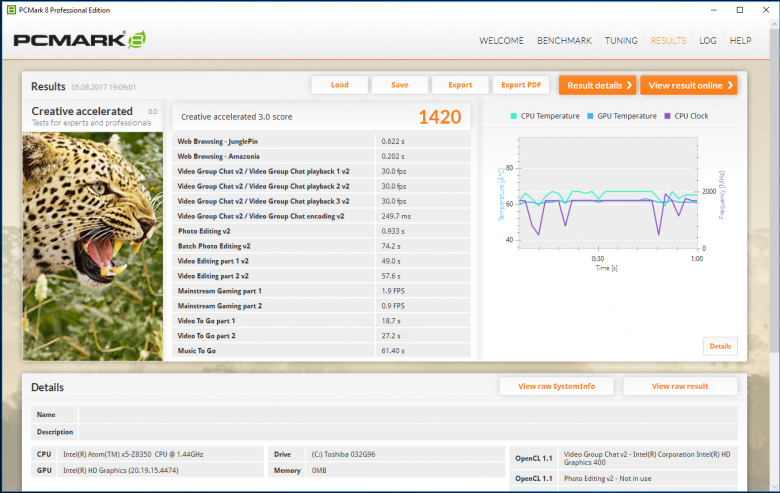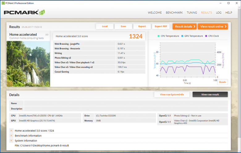 Тестовый пакет PCMark 10 тоже не годится, поскольку он ориентирован на 64-разрядную версию Windows. В общем, единственным вариантом, который мы смогли применить, оказалось тестирование с помощью пакета PCMark 8, который совместим с 32-разрядными версиями ОС. Этот пакет мы обычно используем для тестирования Windows-планшетов, на которых, как правило, устанавливается 32-разрядная версия Windows. Подробно о тестовом пакете PCMark 8 Professional Edition (2.7.613) можно прочитать в нашем обзоре. Во всех тестах применялся режим Accelerated, подразумевающий использование технологии OpenCL. Результаты тестирования в баллах приведены в таблице и на скриншотах.