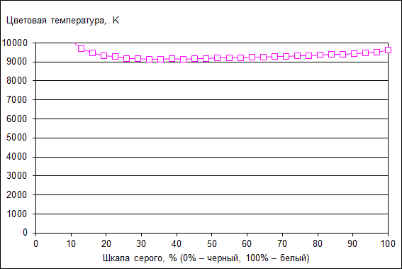 Цветовая температура ЖК-экрана ноутбука стабильна по всей шкале серого (темные области можно не учитывать из за погрешности измерения) и составляет примерно 9100 K.