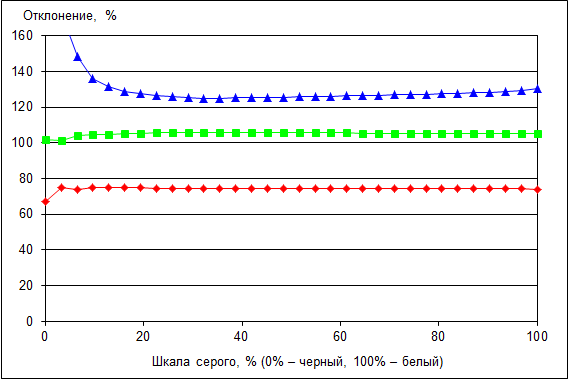Стабильность цветовой температуры объясняется тем, что основные цвета хорошо сбалансированы по всей шкале серого.