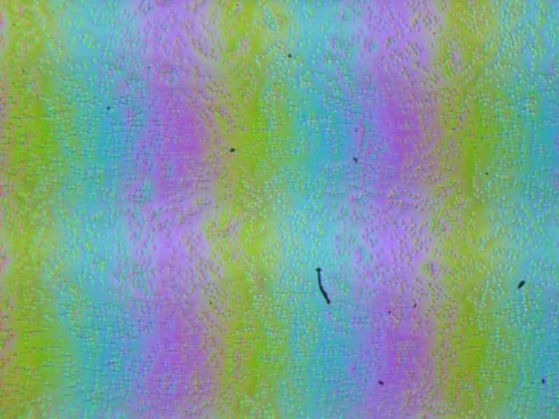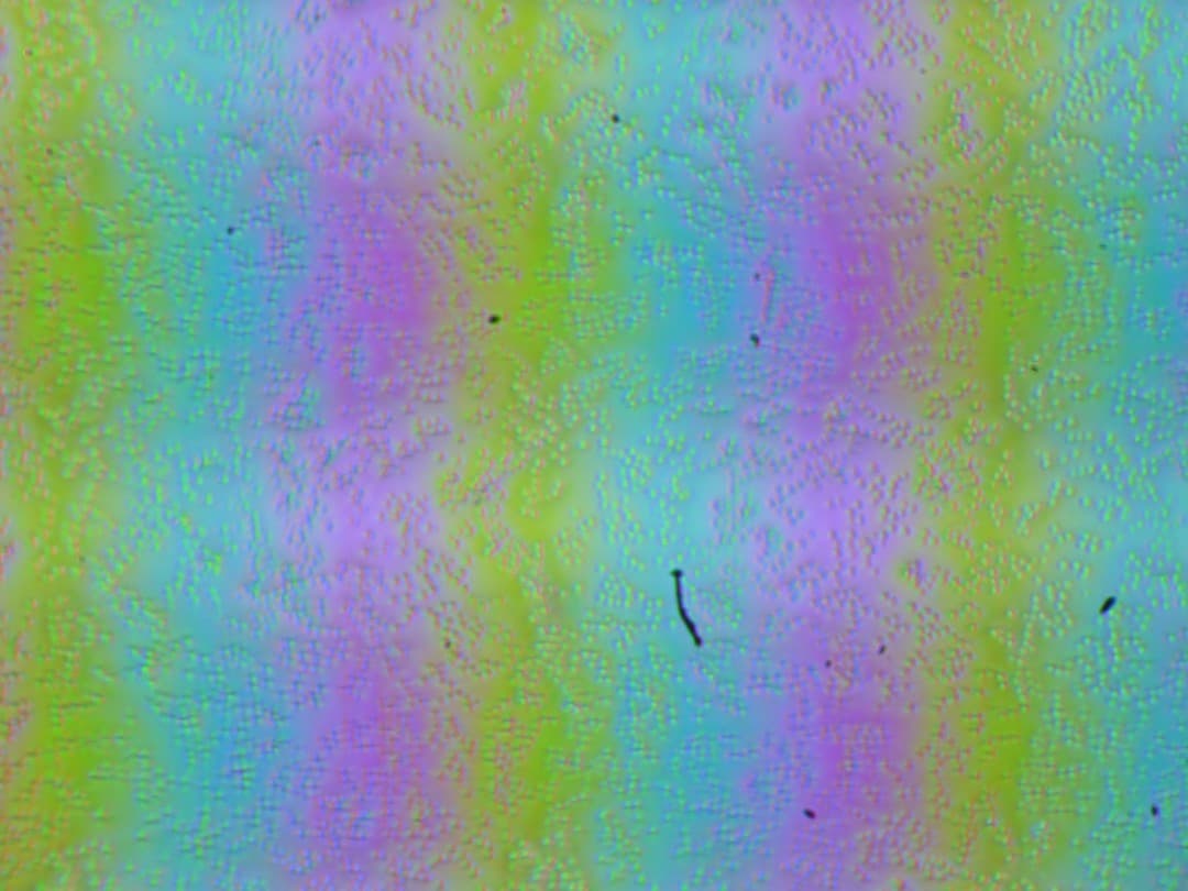 Зерно этих дефектов в несколько раз меньше размеров субпикселей (масштаб этих двух фотографий примерно одинаковый), поэтому фокусировка на микродефектах и «перескок» фокуса по субпикселям при изменении угла зрения выражены слабо, из-за этого нет и «кристаллического» эффекта.