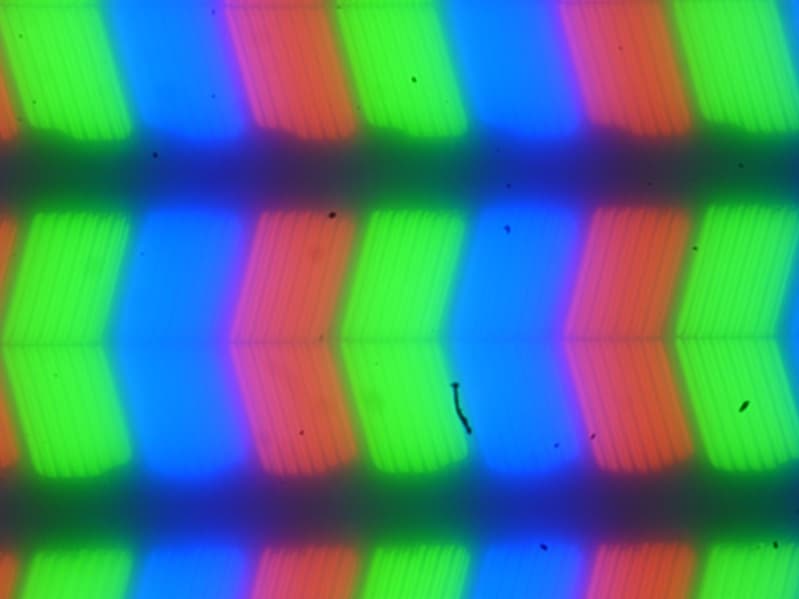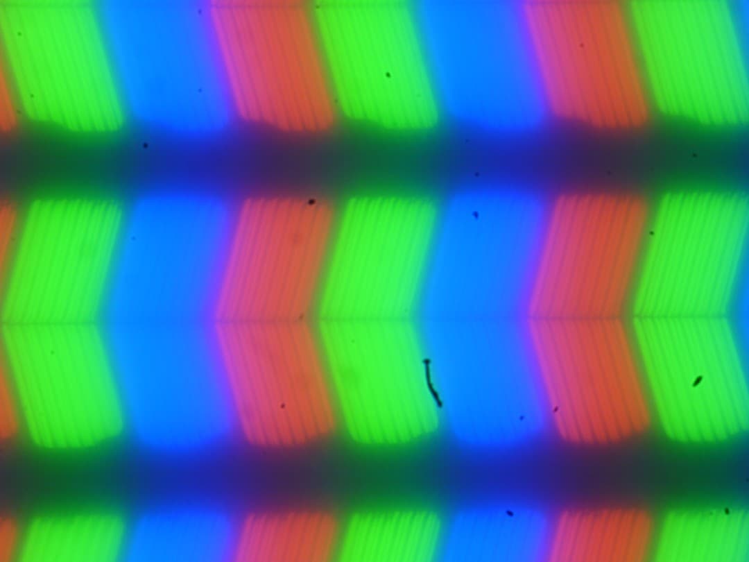 В этом ноутбуке используется матрица типа IPS. Микрофотографии демонстрируют типичную для IPS структуру субпикселей (черные точки — это пыль на матрице фотоаппарата):