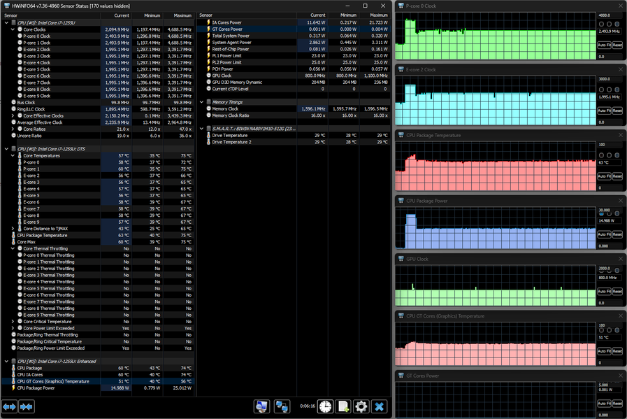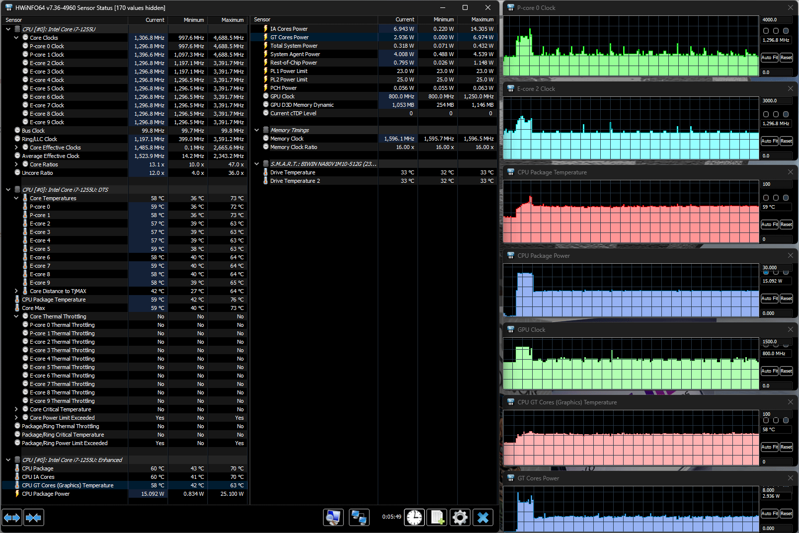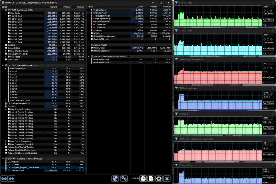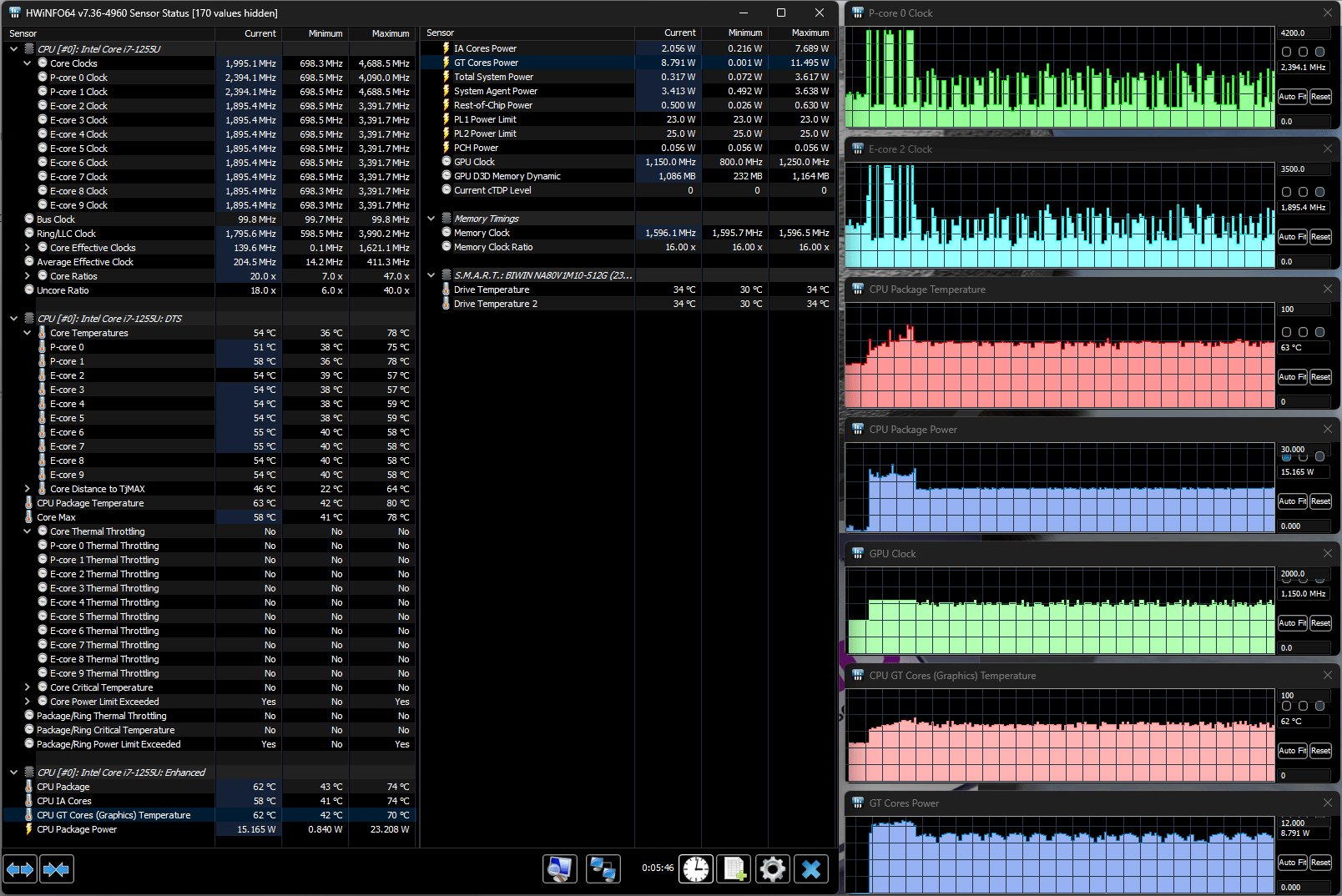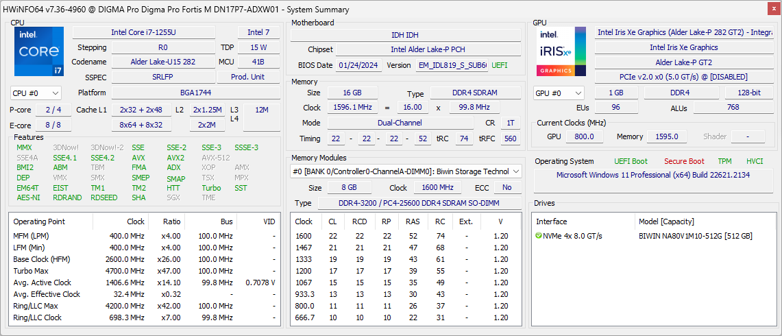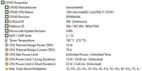 В ноутбуке установлен процессор Intel Core i7-1255U (кодовое наименование Alder Lake, техпроцесс 10 нм, поставляется с начала 2022 года). У него десять ядер, два из которых производительные (P-cores), способные обрабатывать данные в два потока, их базовая тактовая частота 1,7 ГГц, максимальная в турборежиме 4,7 ГГц, остальные восемь ядер однопоточные энергоэффективные (E-cores) с частотами 1,2/3,5 ГГц соответственно.