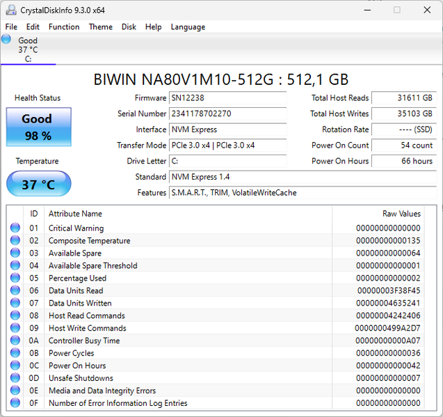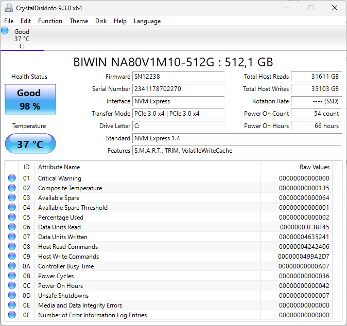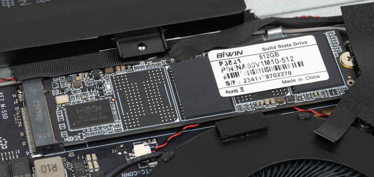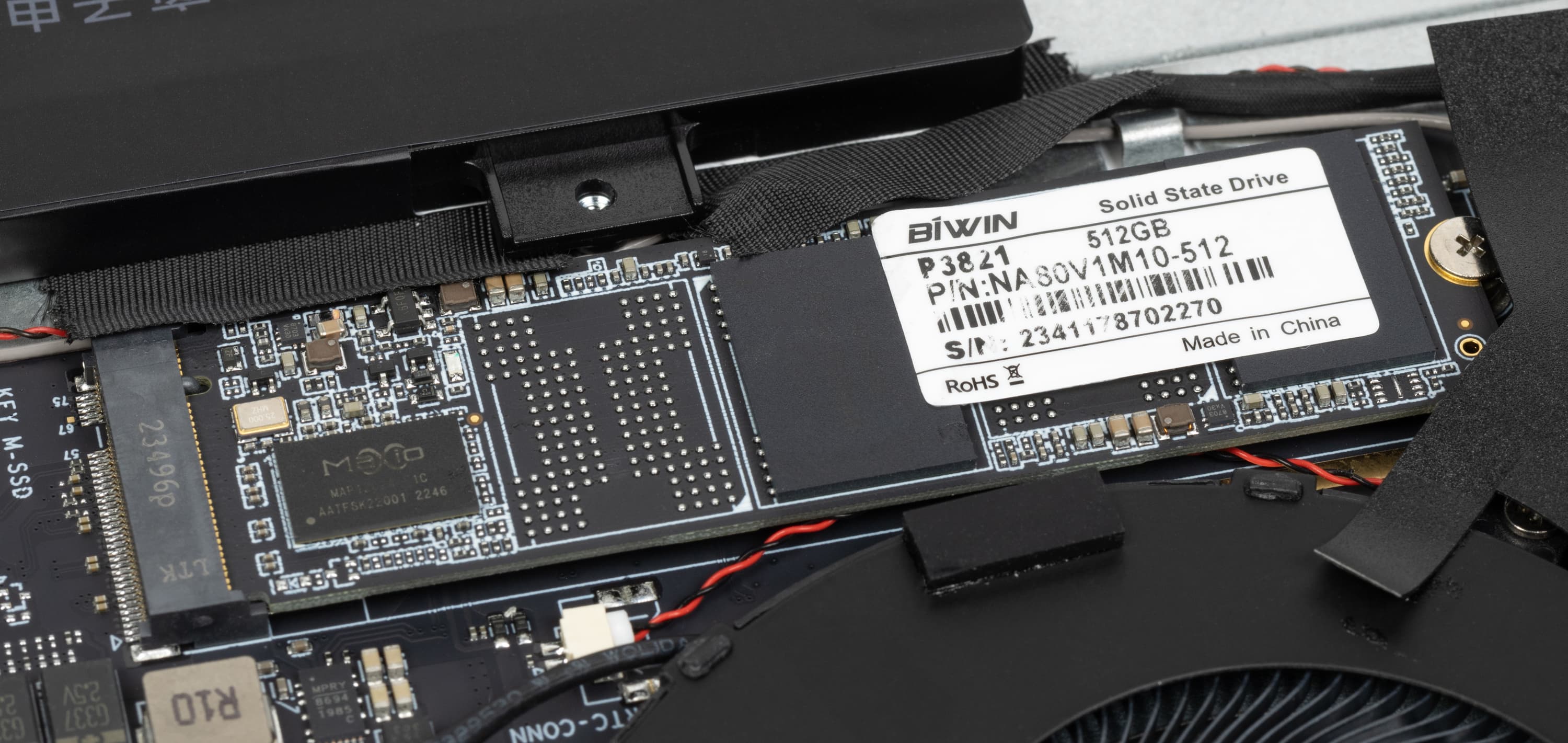 Установлен накопитель BIWIN NA80V1M10-512G (M.2 2280, NVMe, PCIe 3.0 x4) на 512 ГБ.