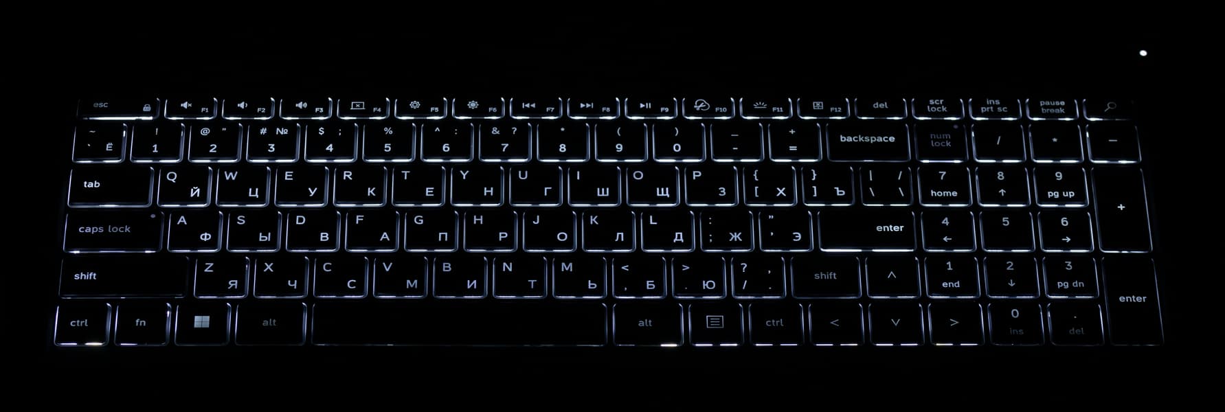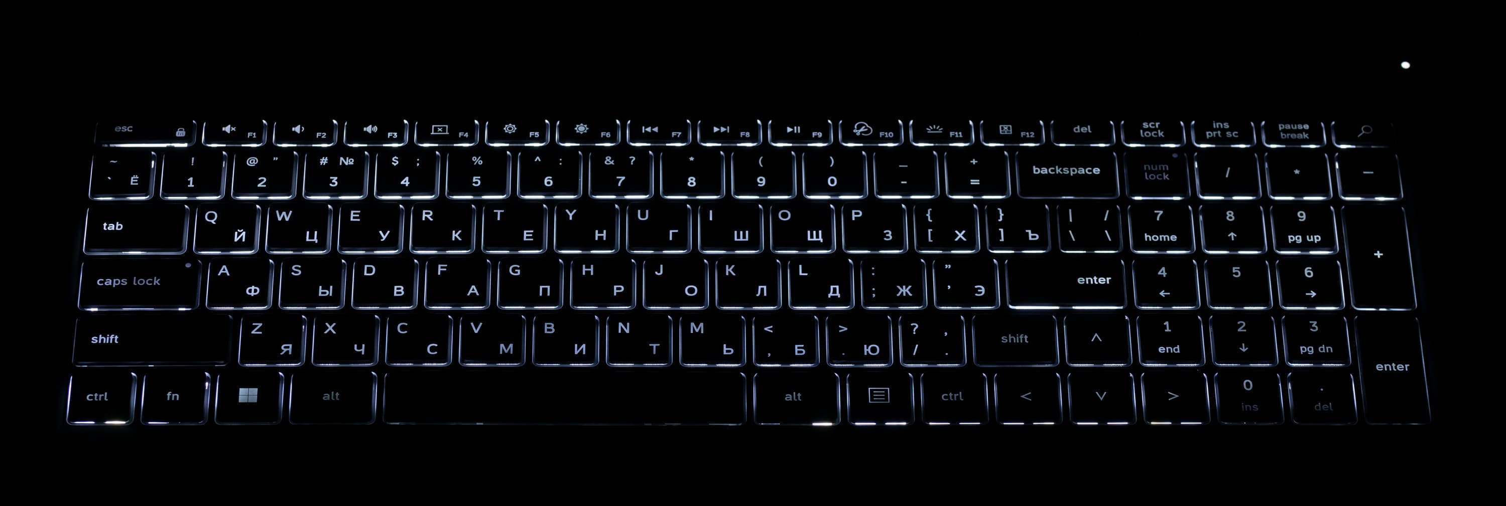 Предусмотрена подсветка — белая, с двумя уровнями, на максимуме довольно яркая. Ее можно отключить совсем, но даже при задействовании она будет автоматически отключаться через 20 секунд, если клавиатура не используется, и вновь включаться после нажатия любой кнопки (касания тачпада на подсветку не влияют).