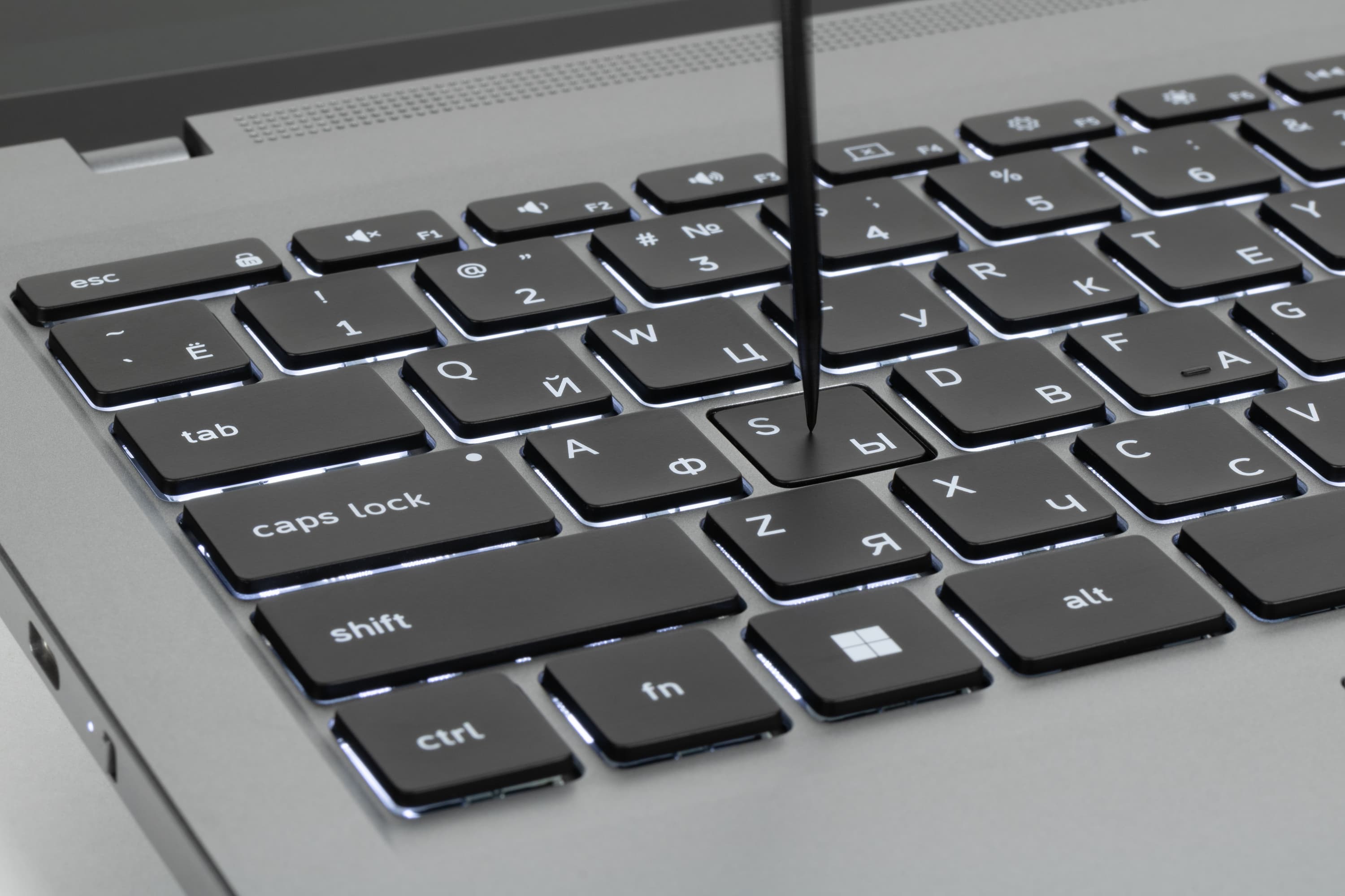 Большинство кнопок (включая стрелки и цифровой блок) даже чуть больше обычного для ноутбуков размера — 16,6×16,6 мм, функциональные меньше по высоте: 16,6×8,7 мм; левый Shift широкий — 42 мм, правый гораздо более узкий — 22 мм, ширина Enter 32 мм.