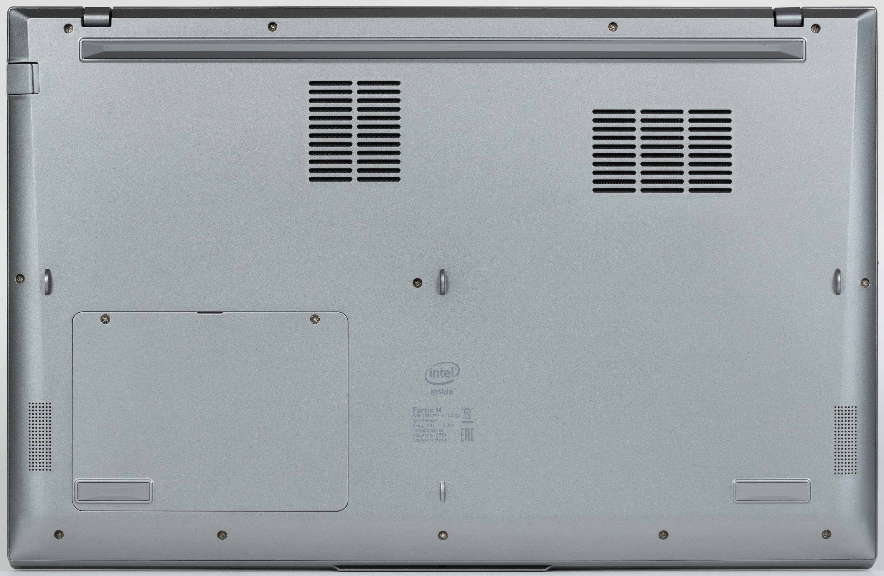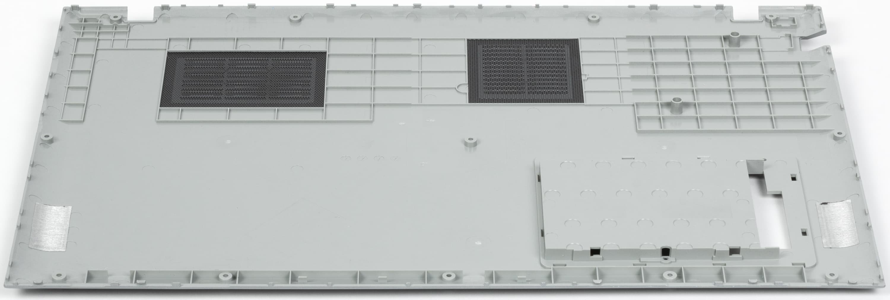 На днище, кроме трех ножек (две передние короткие, единая задняя вытянулась почти по всей длине, в середине есть дополнительные выступы-опоры), ближе к задней кромке имеются две небольшие области с вентиляционными прорезями, через них происходит забор воздуха для охлаждения компонентов, поэтому ставить ноутбук на мягкую поверхность не следует. А впереди находится закрепленная двумя винтами крышка отсека для дополнительного накопителя.