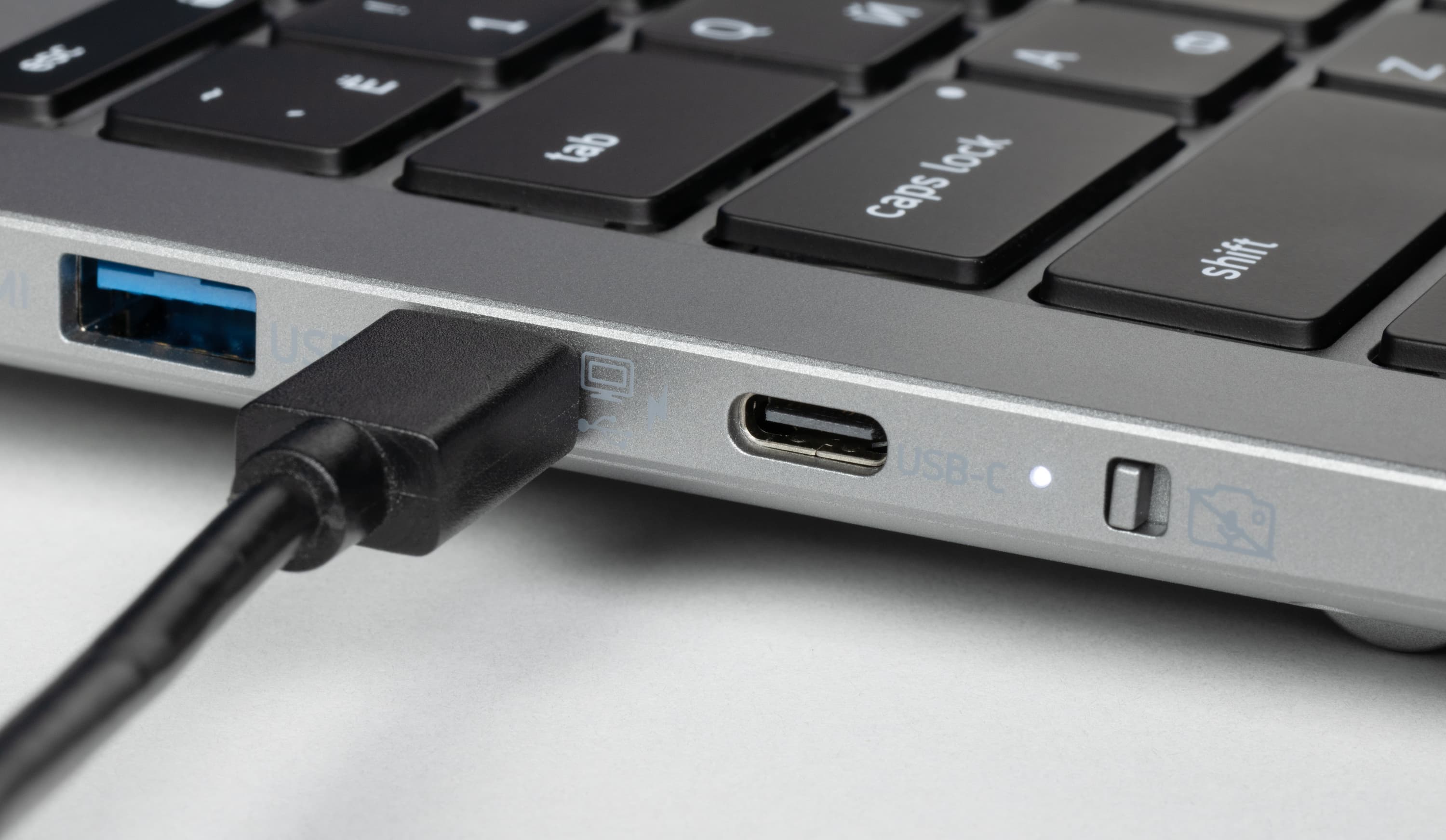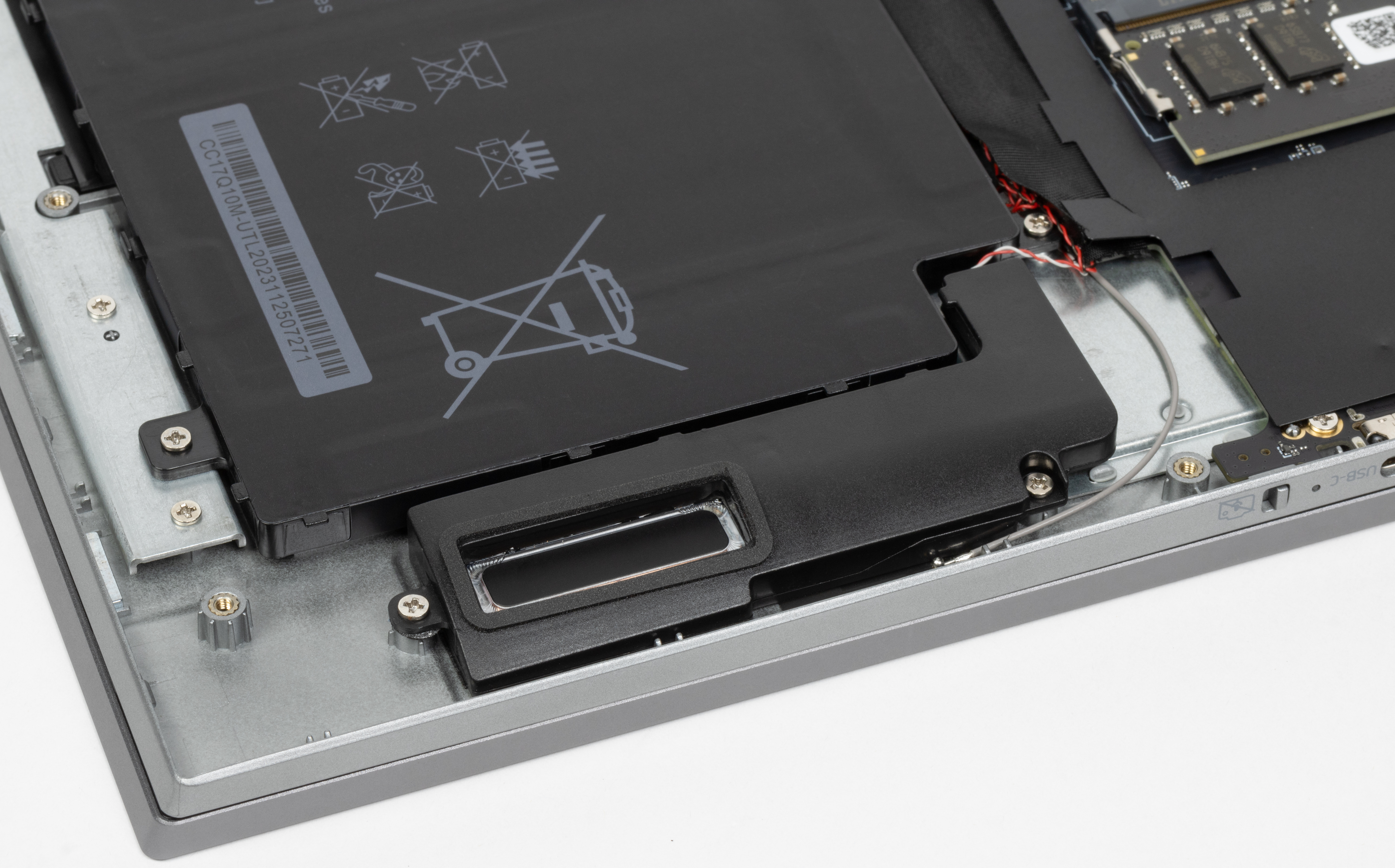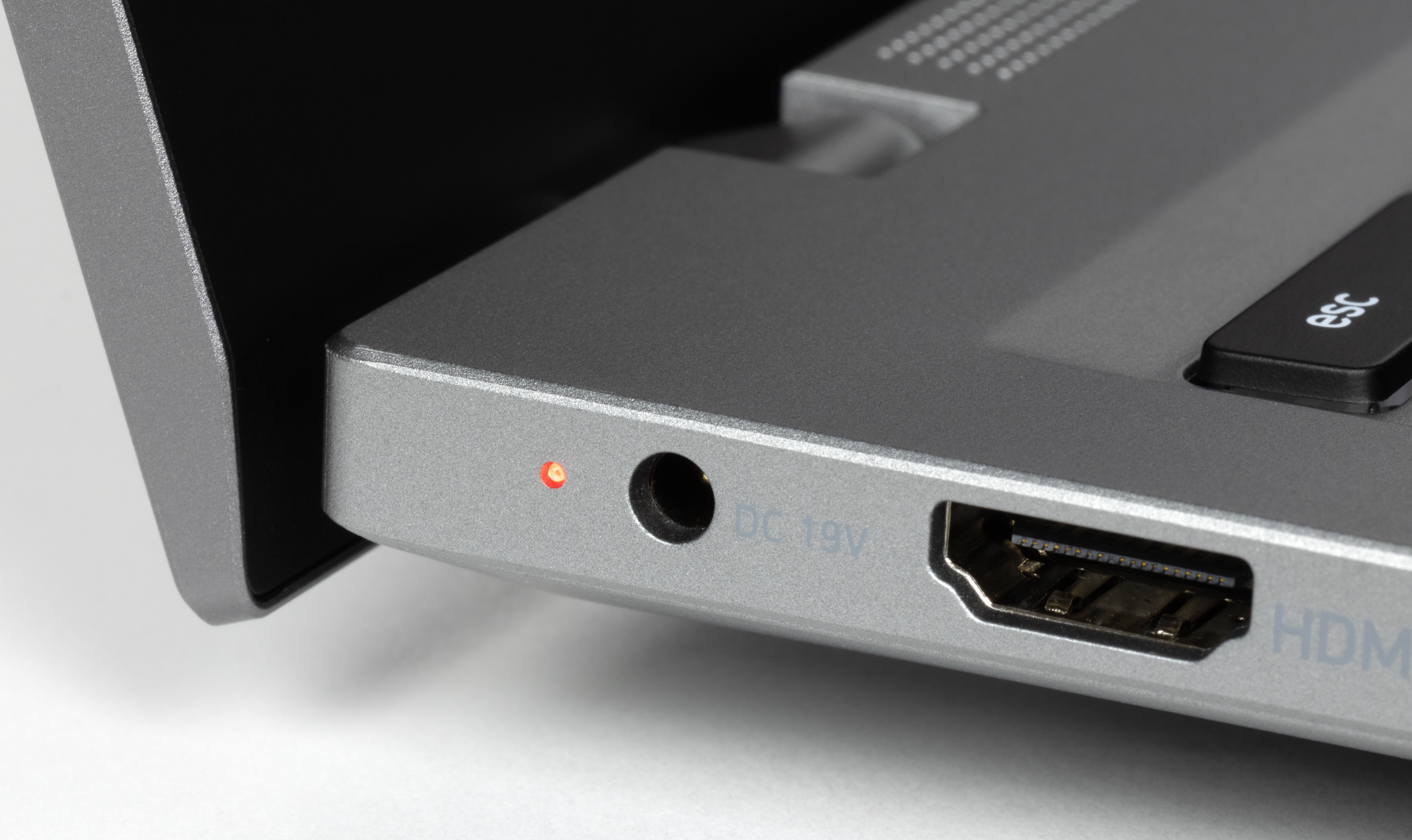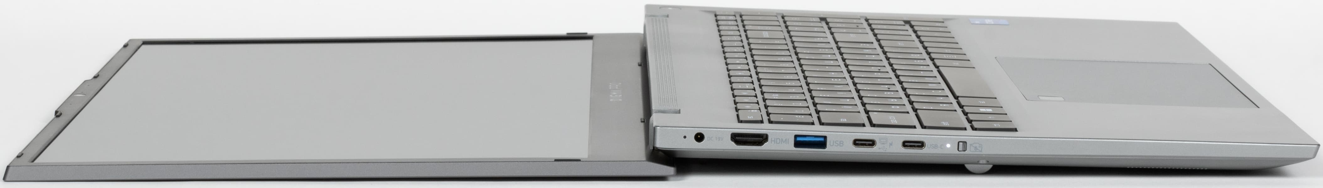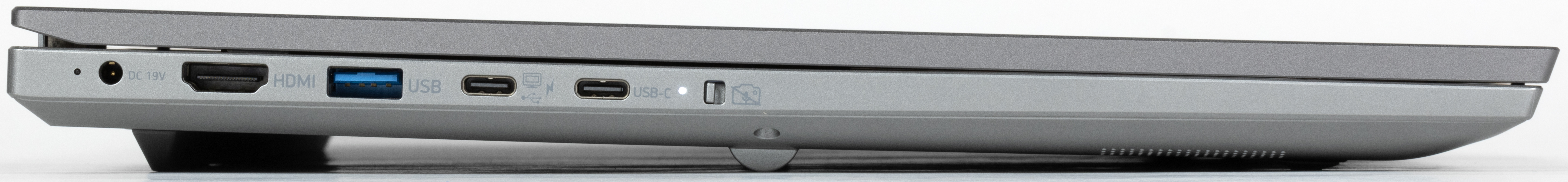 На левом боку ближе к задней части имеется гнездо для подключения внешнего источника с напряжением 19 вольт и цилиндрическим (коаксиальным) коннектором — видимо, оно унаследовано от более ранних моделей Fortis M и Sprint M, которые комплектовались именно такими БП, хотя поддерживали и питание через порт Type-C; имеется крошечный индикатор, цветом показывающий состояние батареи. Затем идут порты HDMI (полноразмерный), USB3 Type-A, USB3 Type-C с поддержкой передачи данных, питания PD и вывода видеосигнала, а также еще один Type-C, на этот раз USB 2.0 для передачи данных. Самым ближним к передней кромке является механический выключатель веб-камеры с индикатором ее доступности (белый светодиод). Упомянутые индикаторы при нормальном положении оператора не видны, приходится смотреть сбоку.