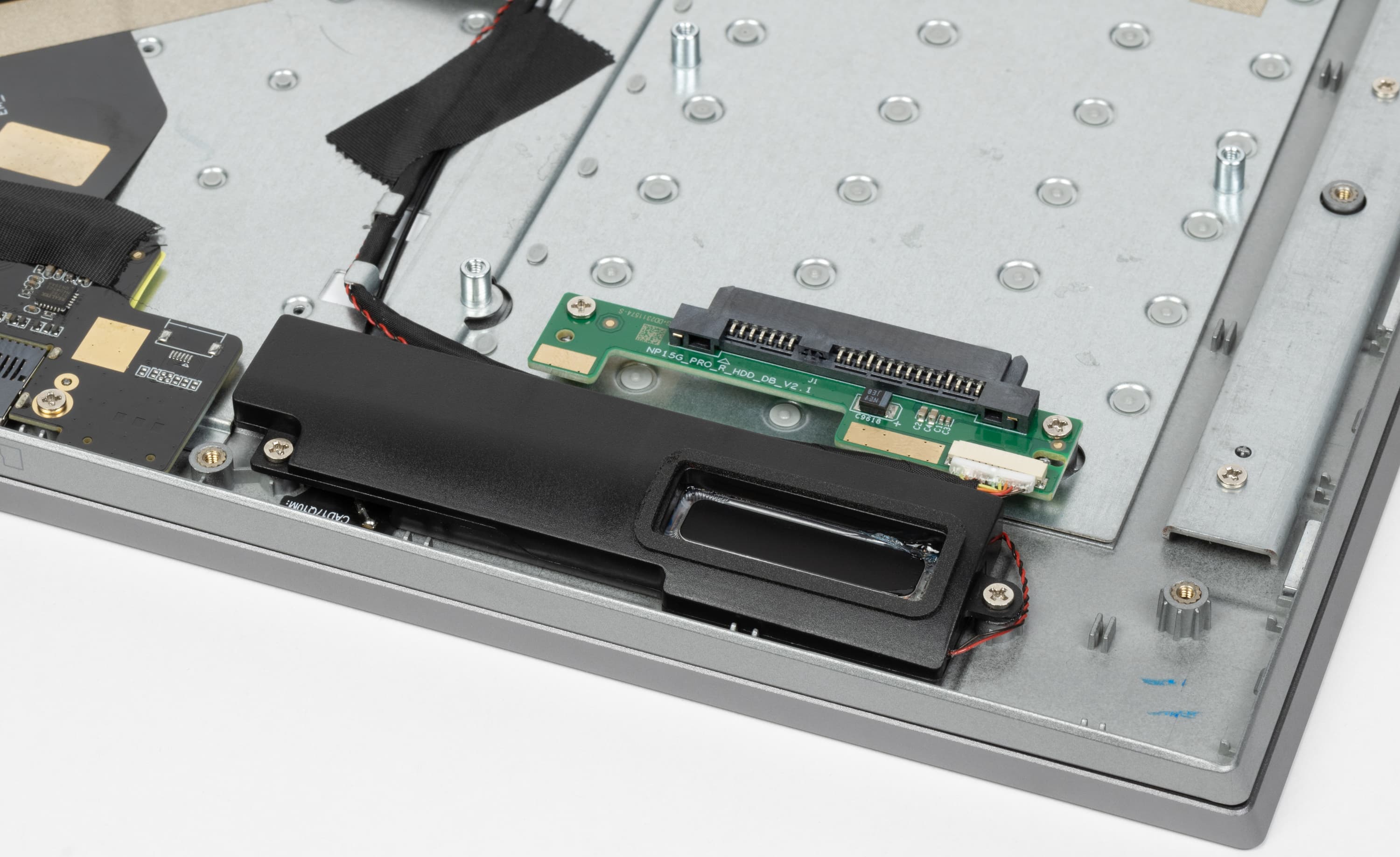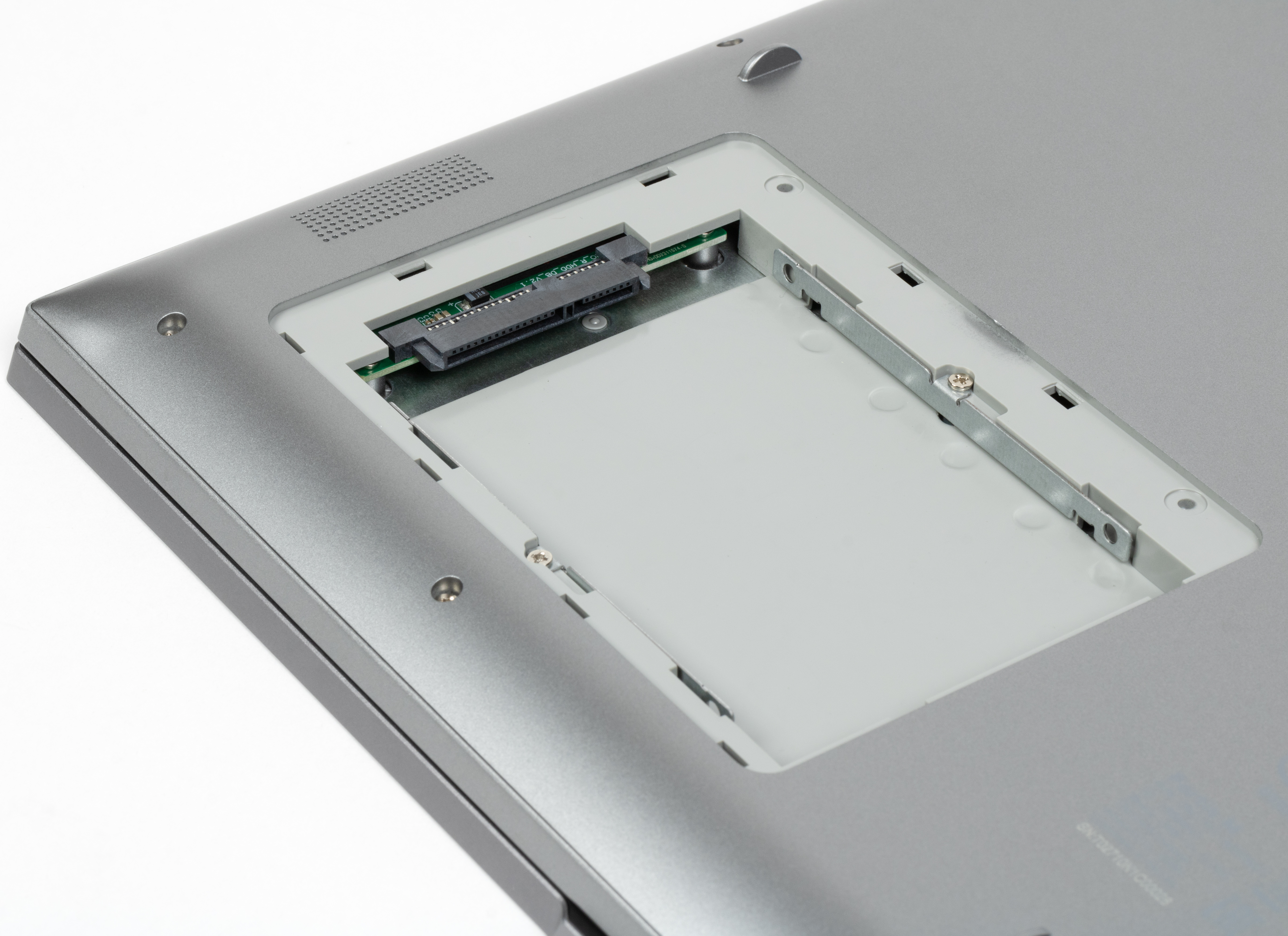 Есть возможность установить второй накопитель размерностью 2,5 дюйма с интерфейсом SATA, для его быстрой установки на днище предусмотрена отдельная крышечка, а в комплекте есть набор крепежных винтов.