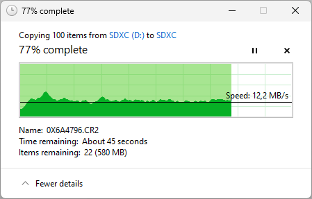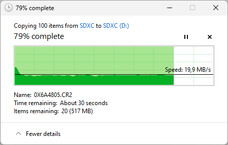 Второй тест — скорость реальных файловых операций, выполняемых средствами ОС: копирование 100 файлов изображений общим объемом 2,5 ГБ сначала из папки на рабочем столе на носитель, затем с носителя в папку.