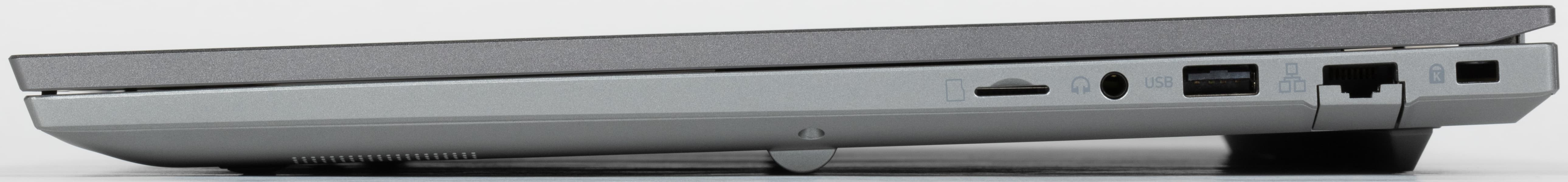 Правый бок: ближе к середине прорезь картовода microSD, затем комбинированный миниджек для аудиогарнитуры, порты USB 2.0 Type-A и RJ-45 (не полноразмерный, а с откидной шторкой), отверстие кенсингтонского замка.