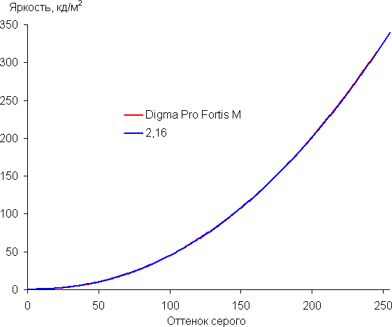 Аппроксимация полученной гамма-кривой дала показатель 2,16, что близко к стандартному значению 2,2. При этом реальная гамма-кривая мало отклоняется от аппроксимирующей степенной функции: