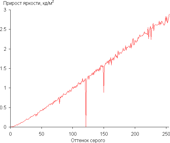 Далее мы измерили яркость 256 оттенков серого (от 0, 0, 0 до 255, 255, 255). График ниже показывает прирост (не абсолютное значение!) яркости между соседними полутонами:
