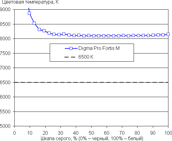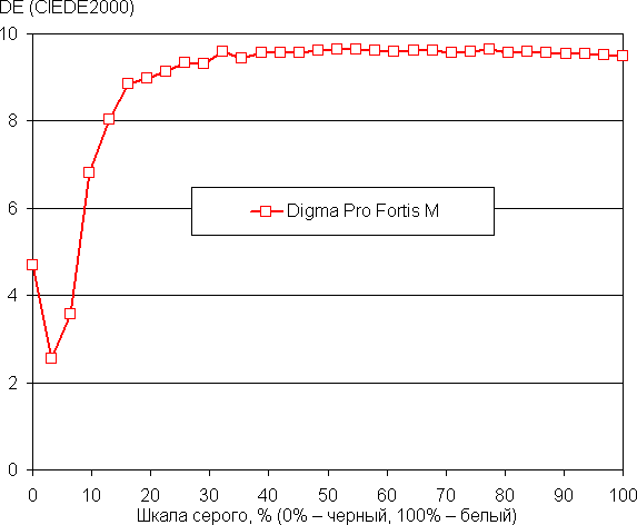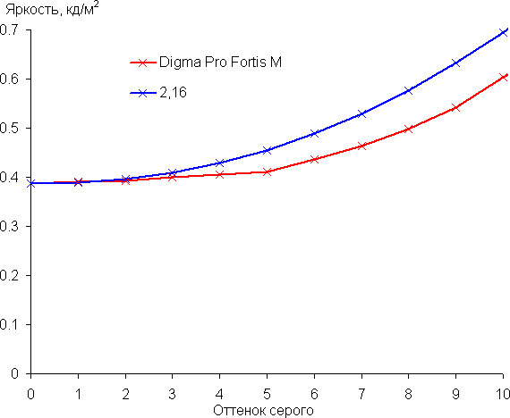 Рост прироста яркости на шкале серого в основном равномерный, и почти каждый следующий оттенок ярче предыдущего. В самой темной области аппаратно и визуально различаются все оттенки:
