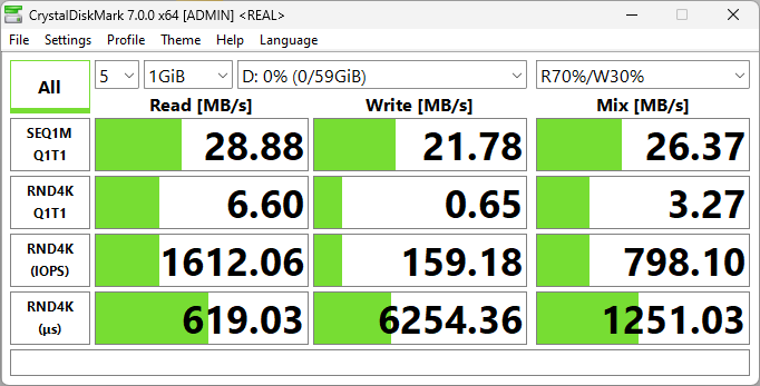 В первом случае процедура заняла 135 секунд, что соответствует средней скорости 18,5 МБ/с, во втором — 215 секунд, или 11,6 МБ/с. Для сравнения: у Digma Pro Sprint M скорости были 18,7 МБ/с и 22,3 МБ/с, у Tecno Megabook T1 — 7,8 МБ/с и 12,2 МБ/с.