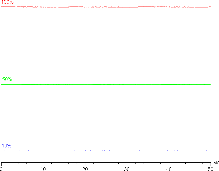 На любом уровне яркости значимая модуляция подсветки отсутствует, поэтому нет и никакого мерцания экрана (нет ШИМ). В доказательство приведем графики зависимости яркости (вертикальная ось) от времени (горизонтальная ось) при различных значениях настройки яркости: