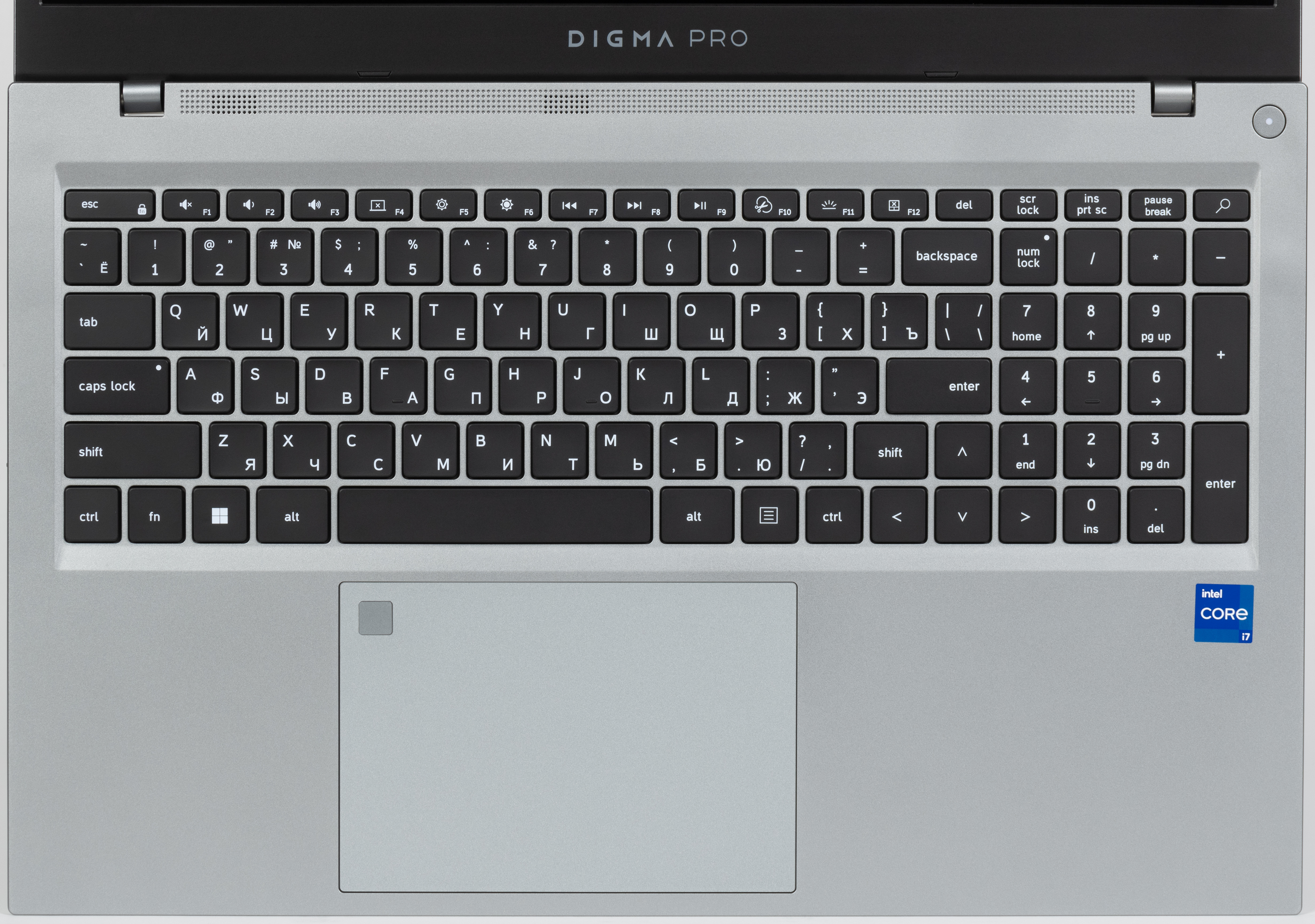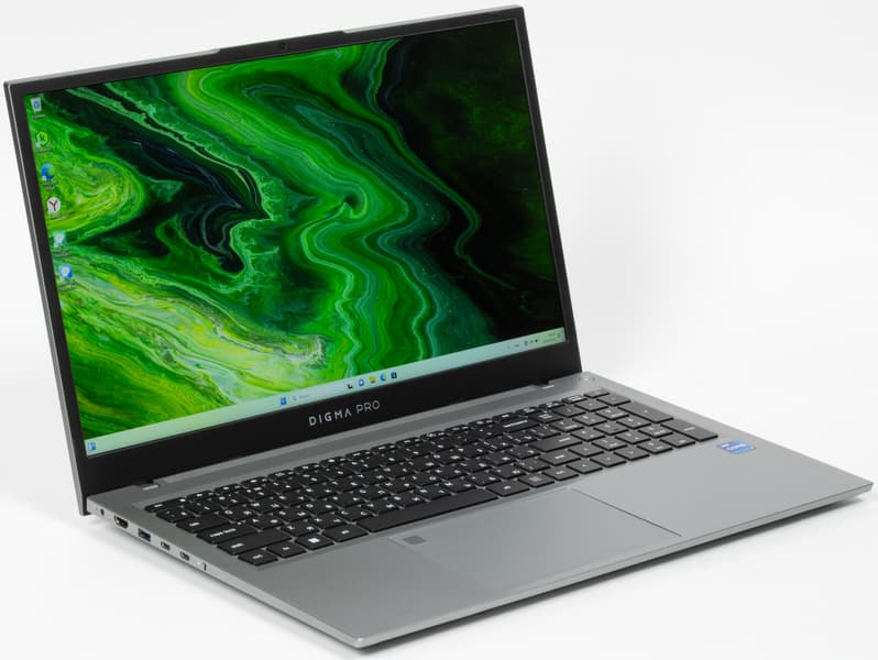 Мы тестировали ноутбук, который на сегодня можно назвать старшим в линейке: Digma Pro Fortis M (DN17P7-ADXW01, ID 1986642) с процессором Intel Core i7-1255U 12-го поколения, ОЗУ объемом 16 ГБ и накопителем на 512 ГБ, на момент публикации обзора он предлагался по цене 65-70 тысяч рублей. Его полная спецификация выглядит так: