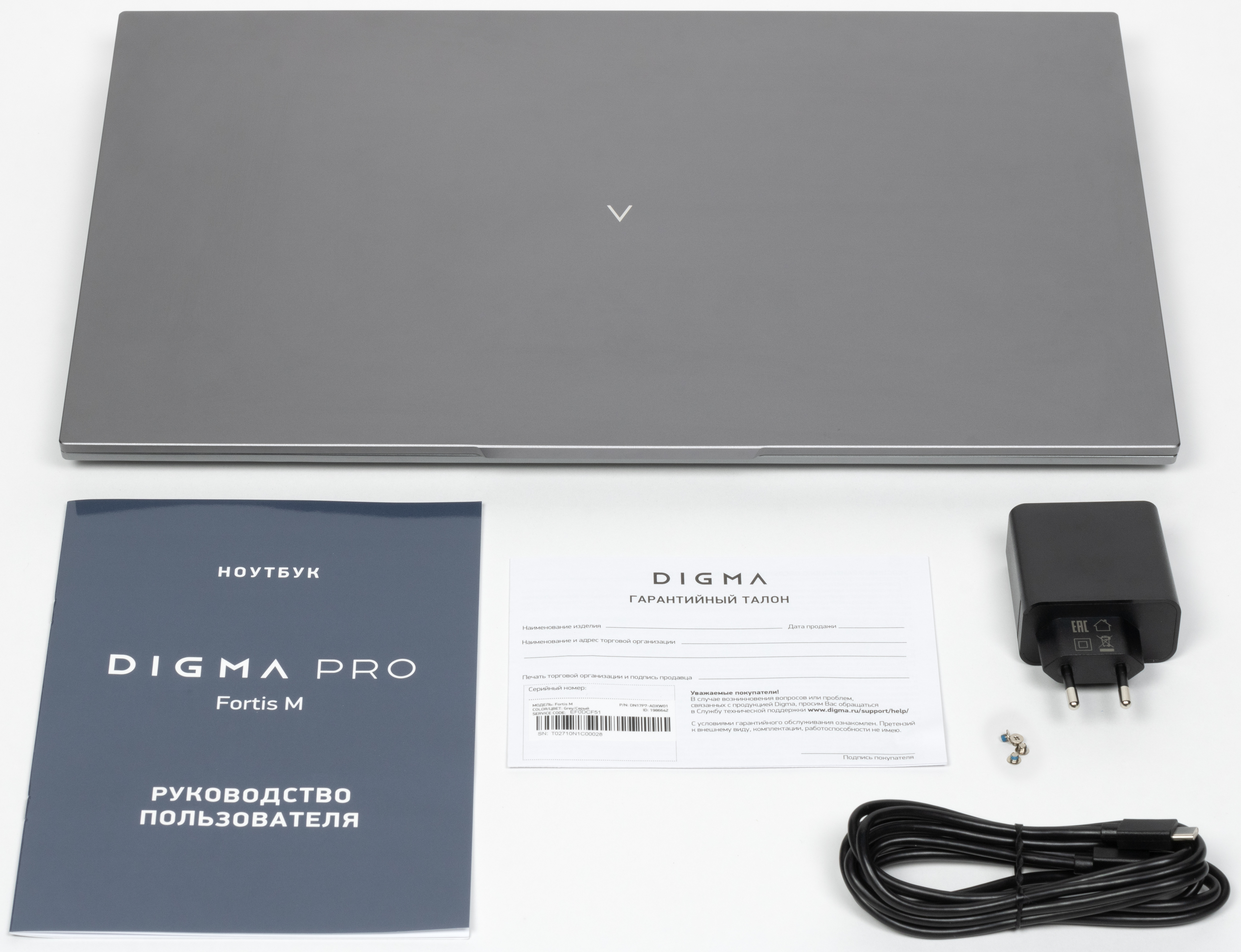 В комплекте, кроме самого ноутбука, идет блок питания со сменным выходным кабелем Type-C — Type-C длиной 2 м, набор винтов, инструкция на русском языке, гарантийный талон.